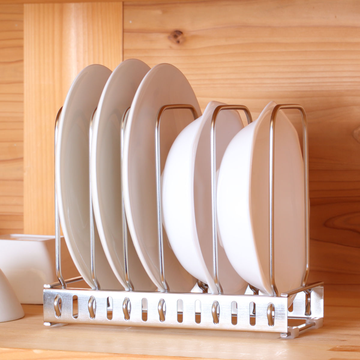 お皿を立てて収納できるスタンドです。並べて収納することで使いたい時に迷わず片手でサッと取り出せます。シンク下の引出しや扉内、食器棚内でもお使いいただけます。