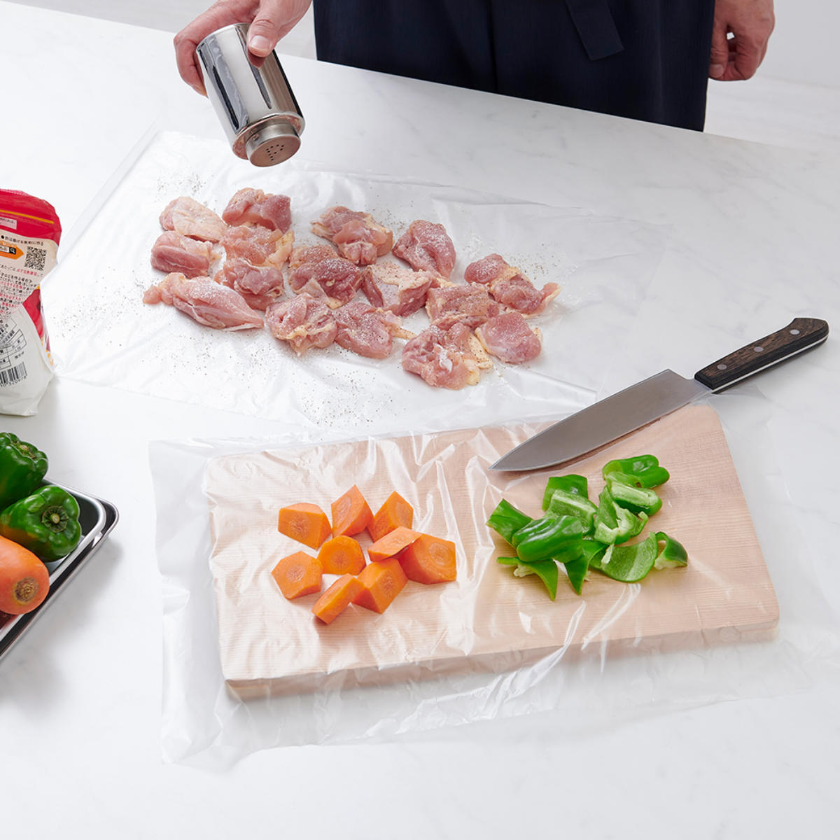 面倒なキッチンの後片付けがラクになる使い切りタイプのシートです。まな板の上に敷いて、使い終わったらそのまま捨てられます。