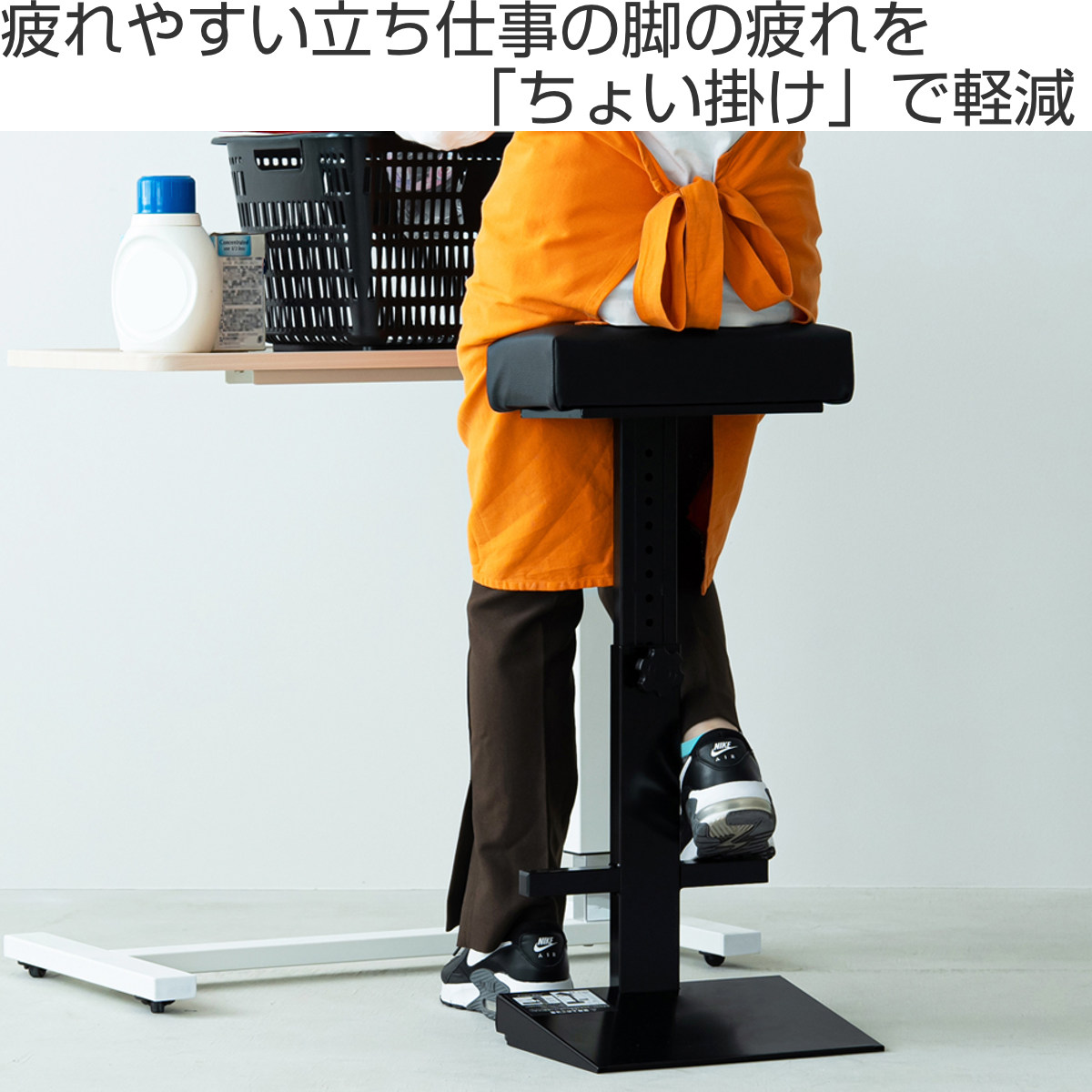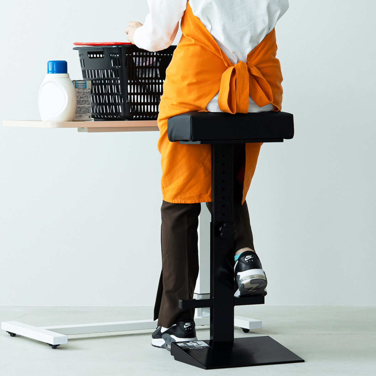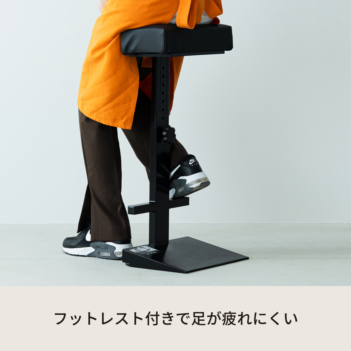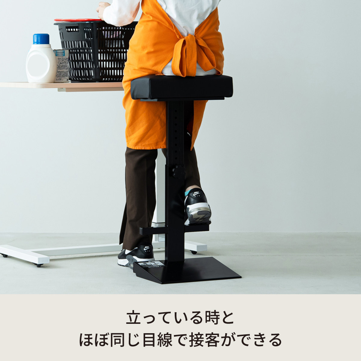 レジ打ち・カウンター接客やライン作業など、疲れやすい立ち仕事をサポートしてくれるレジチェアです。ちょい掛けすることで、脚への負担を軽減してくれます。フットレストに脚をかけるとさらに楽になります。