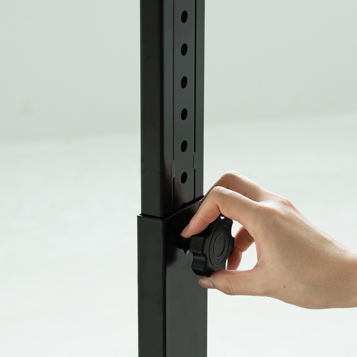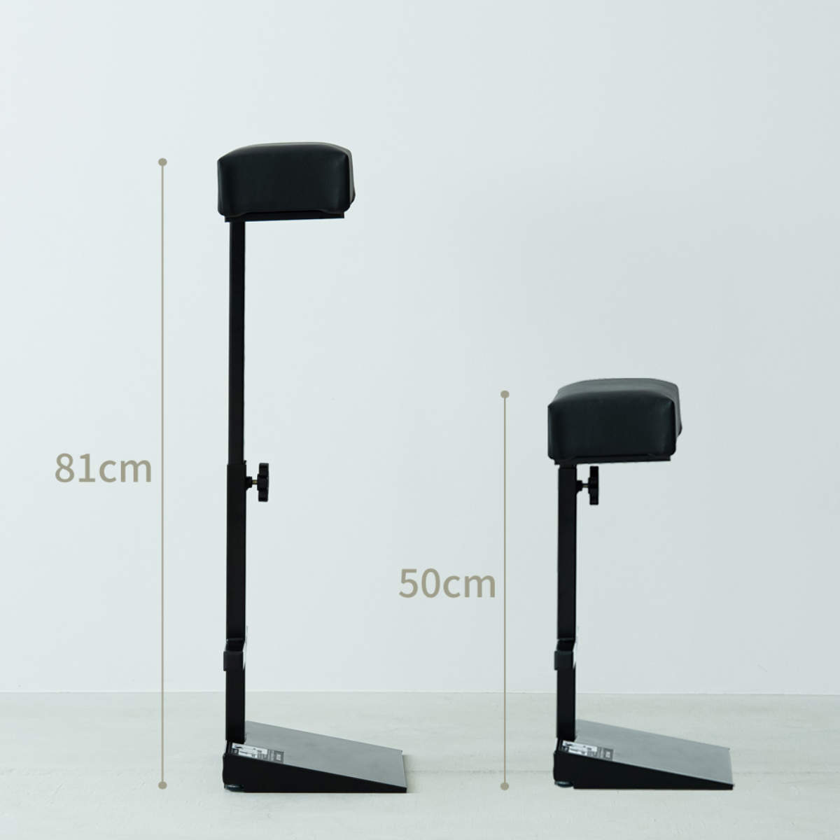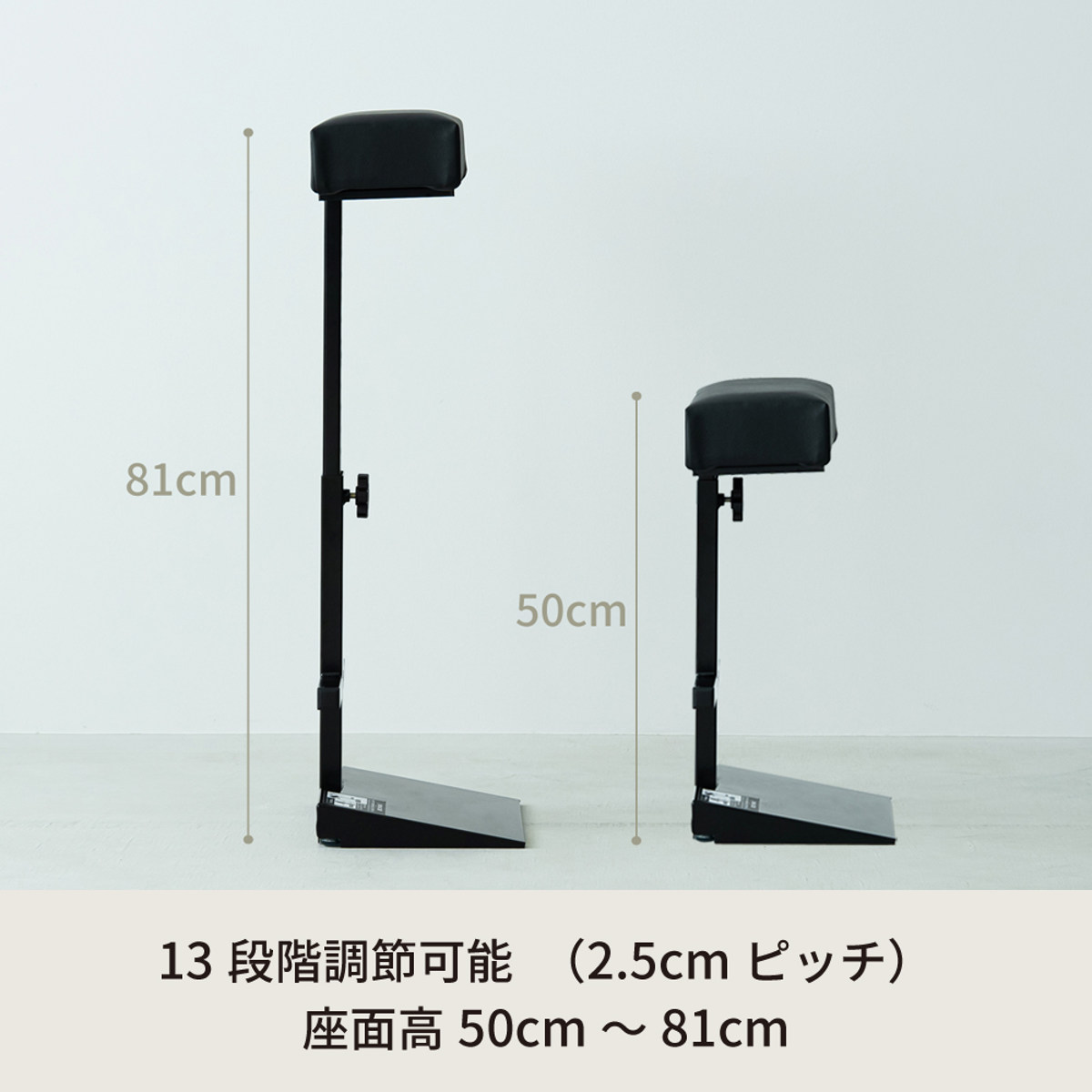使う人に合わせて2.5cmピッチで13段階に調節が可能です。座面高が50cm~81cmまでの間で変えられます。高さ調節は固定力のあるネジ差し込み式。立ち仕事の時とほぼ同じ目線での接客や作業もかないます。