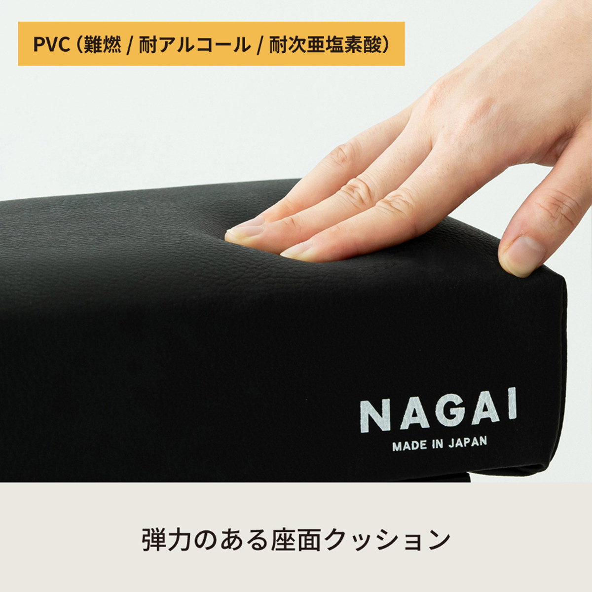 弾力のある座面クッションは、難燃、耐アルコール、耐次亜塩素酸のPVCを使用しているので、様々な職場で安全に使用できます。