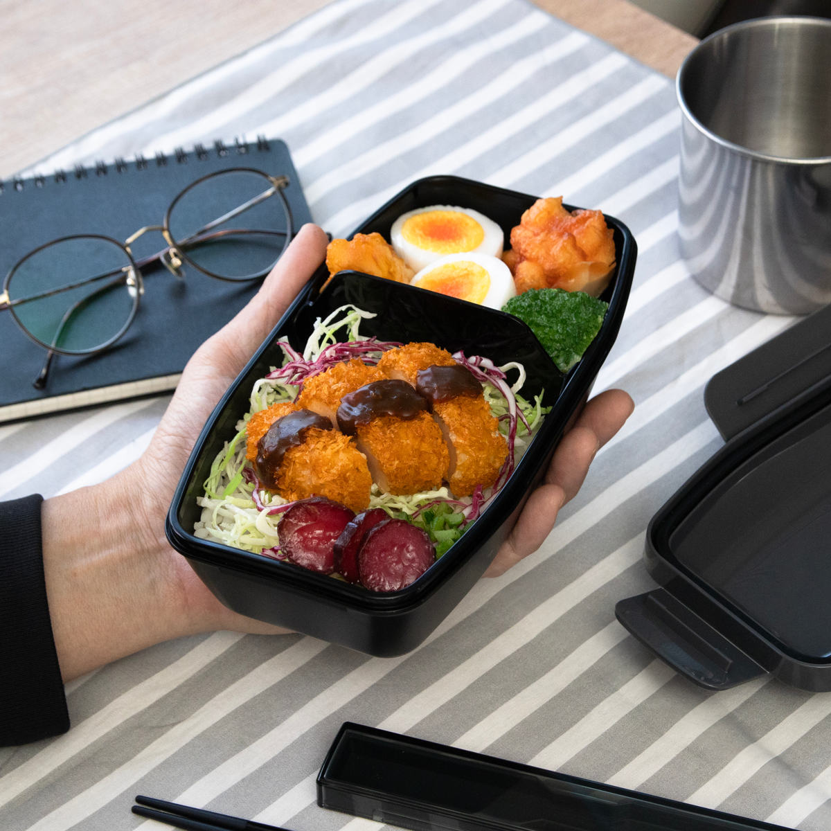 付属の仕切りを使ってご飯とおかずの定番のお弁当から、取り外してオムライスをメインに入れたお弁当、仕切りを端に寄せてのっけ丼とサラダのお弁当など、様々な盛り付け方ができるお弁当箱です。