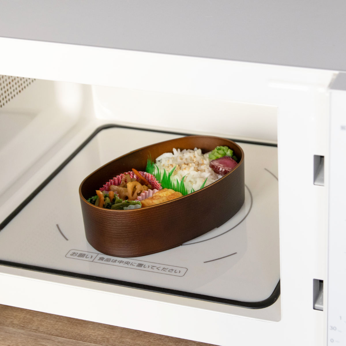 蓋を外すと電子レンジに対応しています。ランチタイムに温かいお弁当を楽しめます。