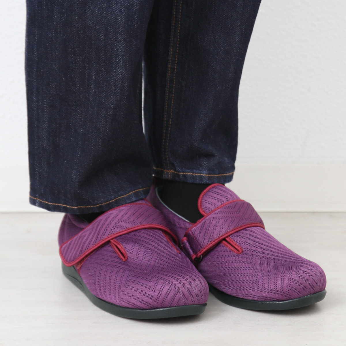 内素材がやわらかくベルトが甲全体に優しくフィットするので、むくみや腫れがあるときも、足の状態に合わせてベルトで調整できます。外反母趾の方や足ゆびに変形・痛みがある方、甲高の方にもおすすめです。ベルトは面ファスナーの調整によって+2cmまで延長できます。