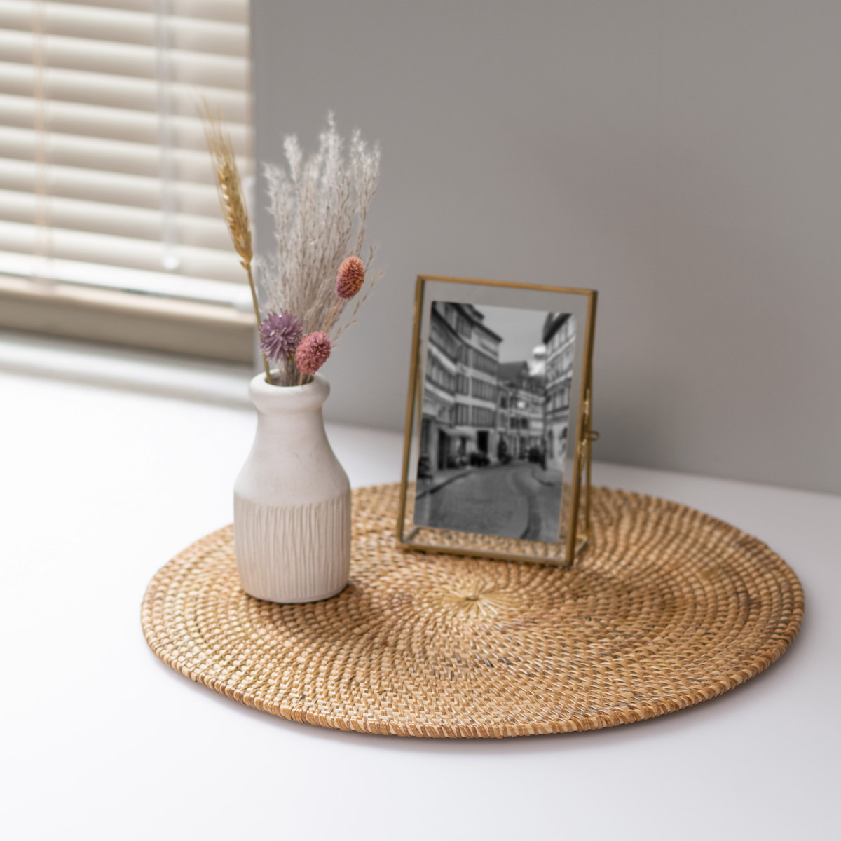 食卓だけでなく、フラワーベースやフォトフレームなどを飾るディスプレイトレイとしてもおすすめです。お気に入りをそのまま飾るよりも、こなれた雰囲気を作ることができます。ハンドメイドならではの温かみや、ラタン素材の優しい風合いをぜひ感じてみてください。