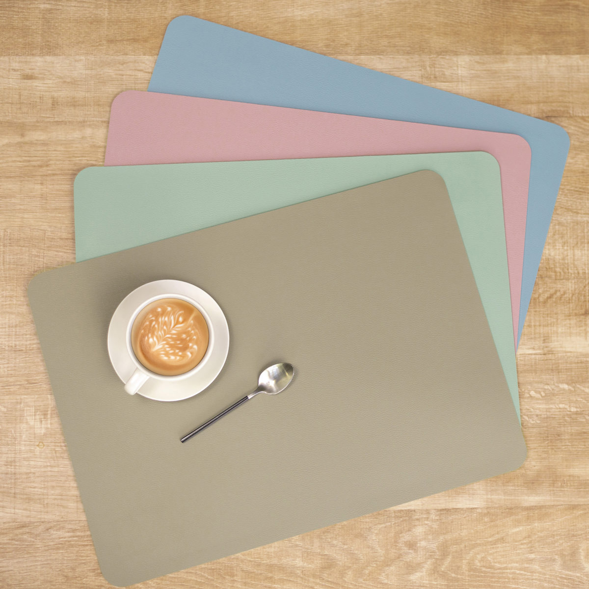 柔らかいレザーのような質感と、少しくすみのある上品なニュアンスカラーを組み合わせたプレイスマットです。いつもの食卓にプラスするだけで料理や器が引き立ち、テーブルコーディネートがより華やかになります。