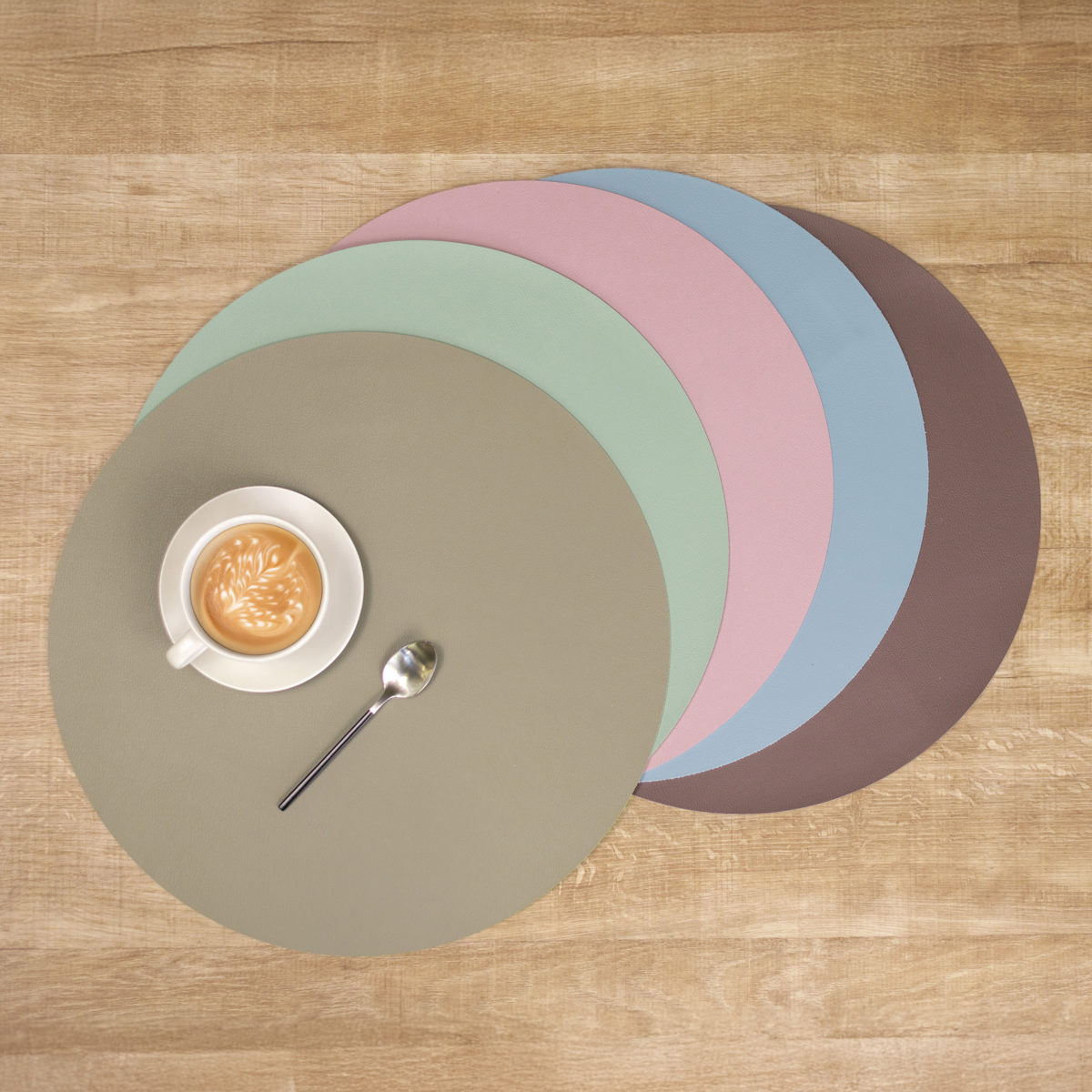 柔らかいレザーのような質感と、少しくすみのある上品なニュアンスカラーを組み合わせたプレイスマットです。いつもの食卓にプラスするだけで料理や器が引き立ち、テーブルコーディネートがより華やかになります。