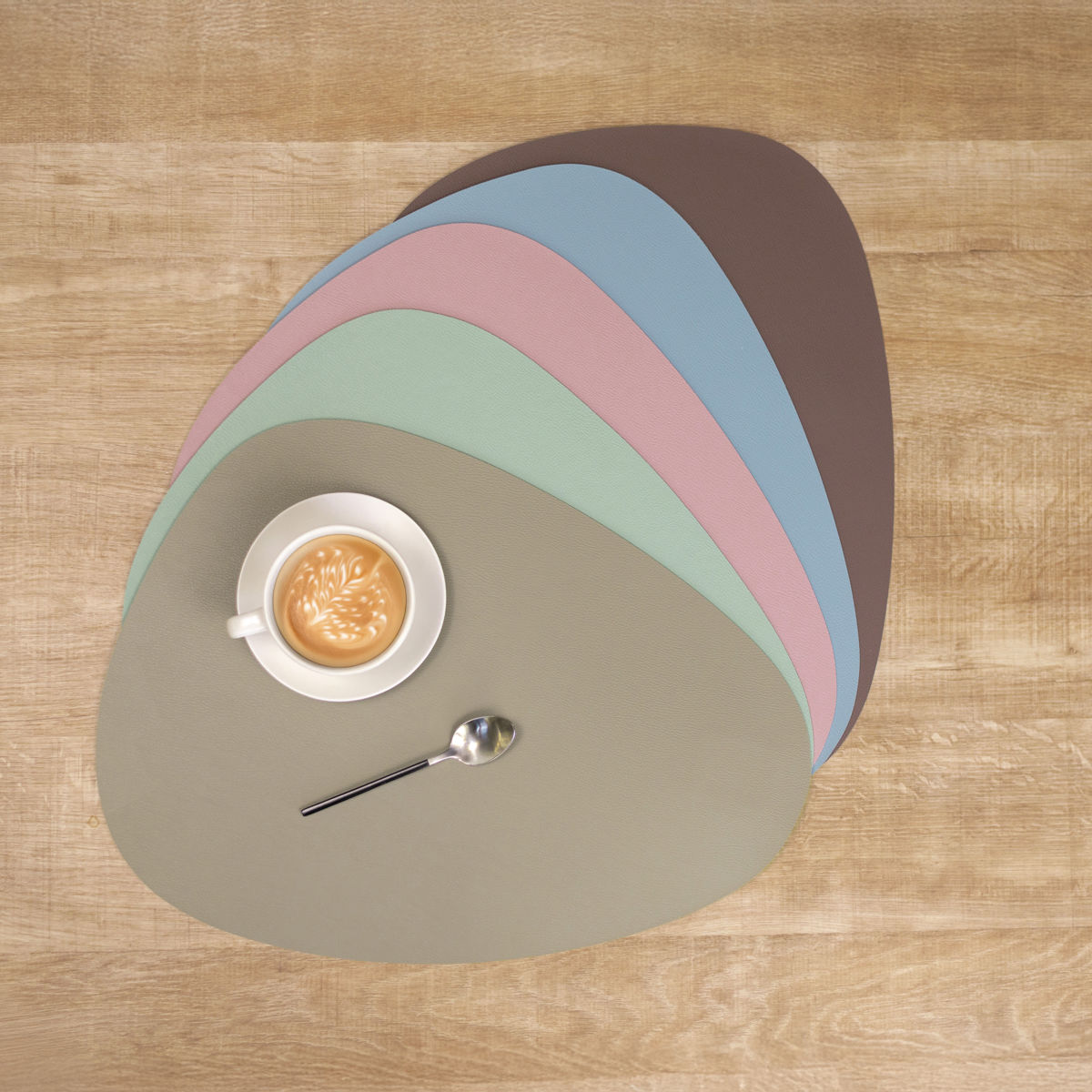 柔らかいレザーのような質感と、少しくすみのある上品なニュアンスカラーを組み合わせたプレイスマットです。いつもの食卓にプラスするだけで料理や器が引き立ち、テーブルコーディネートがより華やかになります。