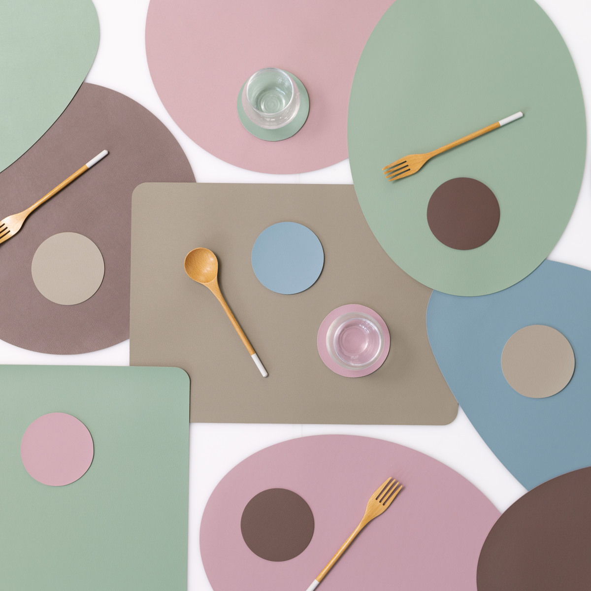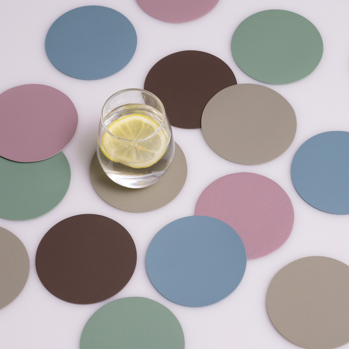 柔らかいレザーのような質感と、少しくすみのある上品なニュアンスカラーを組み合わせたコースターです。いつもの食卓にプラスするだけで料理や器が引き立ち、テーブルコーディネートがより華やかになります。