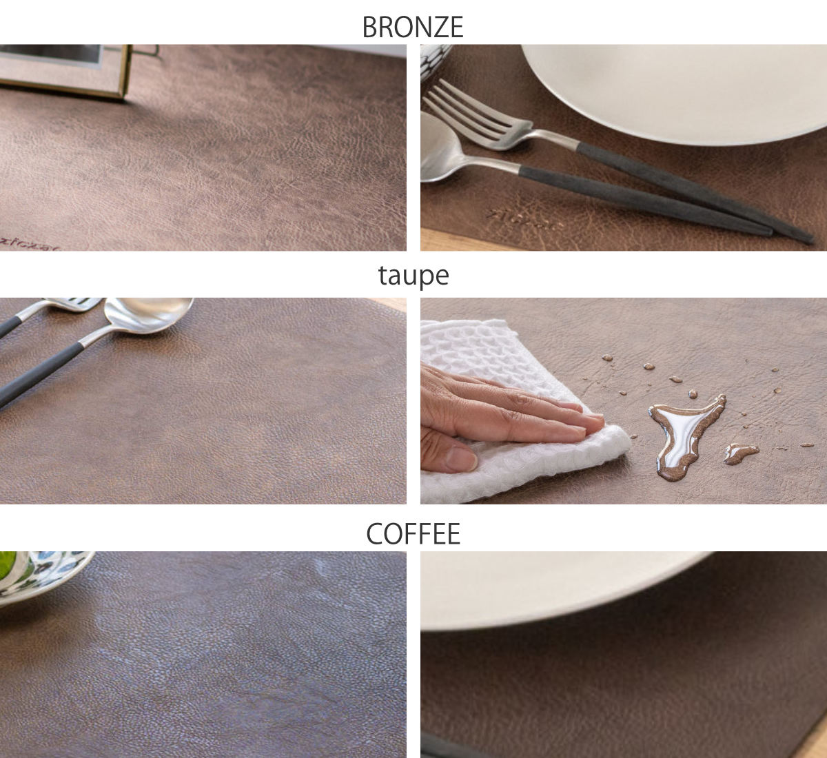 高級感のあるレザー調のTROJAシリーズには、レクタングルとオーバルの2種類のデザイン、ブロンズ・トープ・コーヒーの3色展開です。食卓の雰囲気や使う場所に合わせた、お好みのデザインをお選びください。