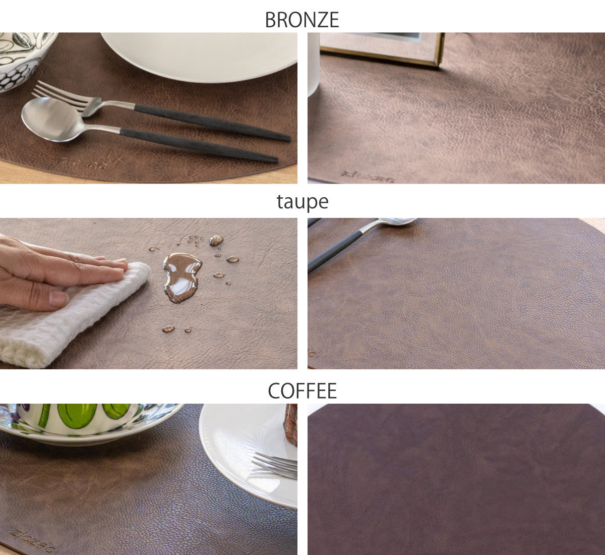 高級感のあるレザー調のTROJAシリーズには、レクタングルとオーバルの2種類のデザイン、ブロンズ・トープ・コーヒーの3色展開です。食卓の雰囲気や使う場所に合わせた、お好みのデザインをお選びください。