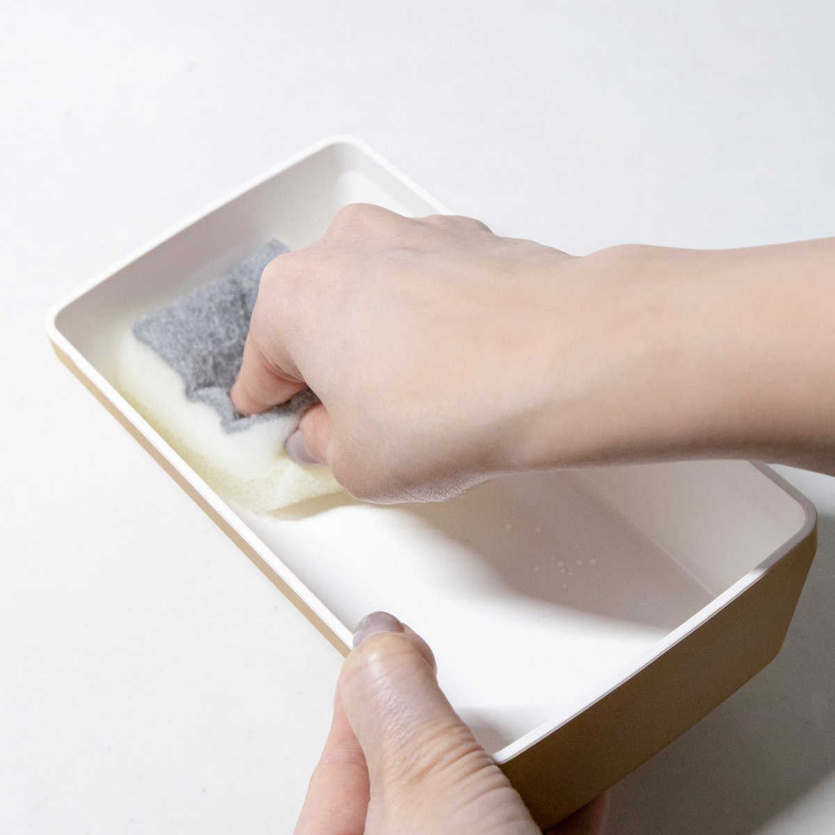 表面はさらさらとした手触り。汚れがつきにくく、臭いが残りにくい特性もあります。洗い終わった後も乾きやすく、手間を省けます。
