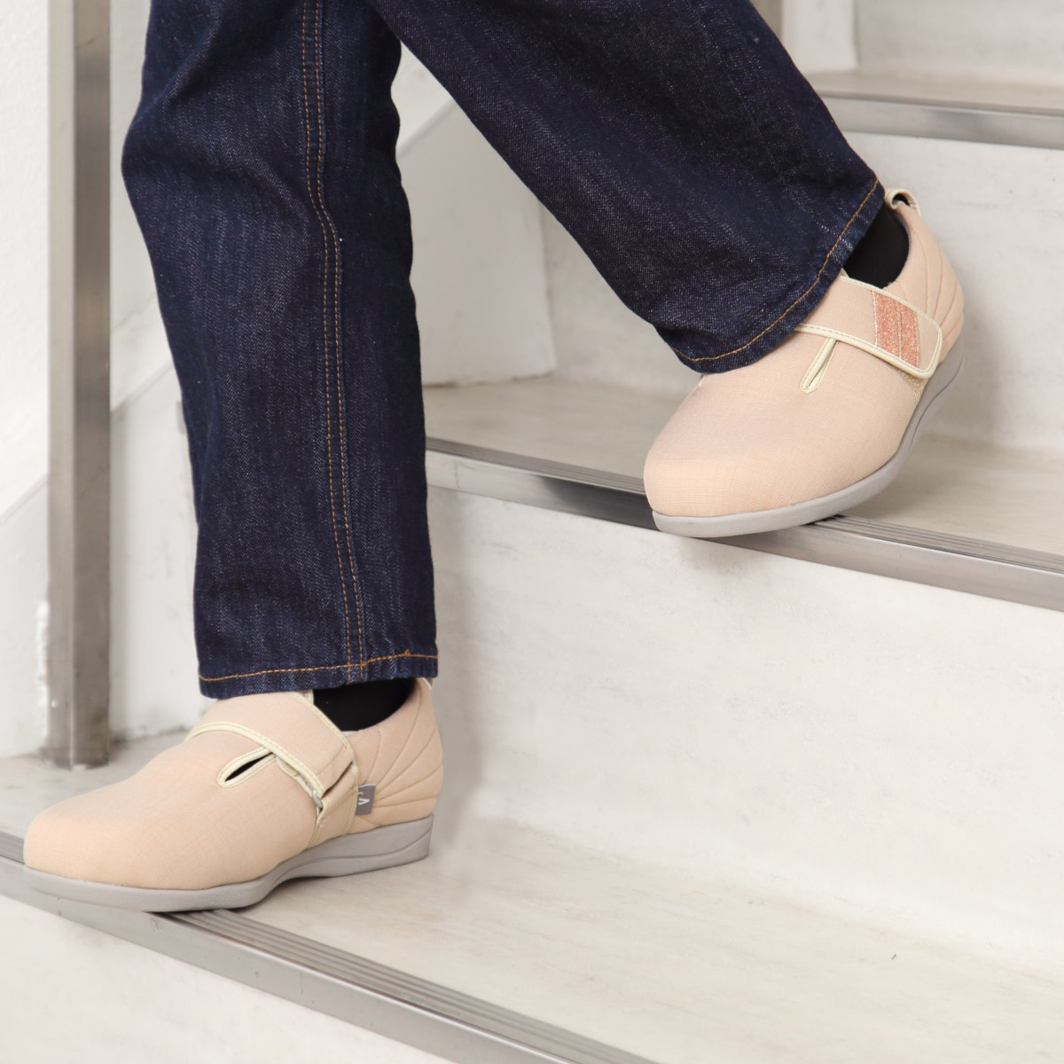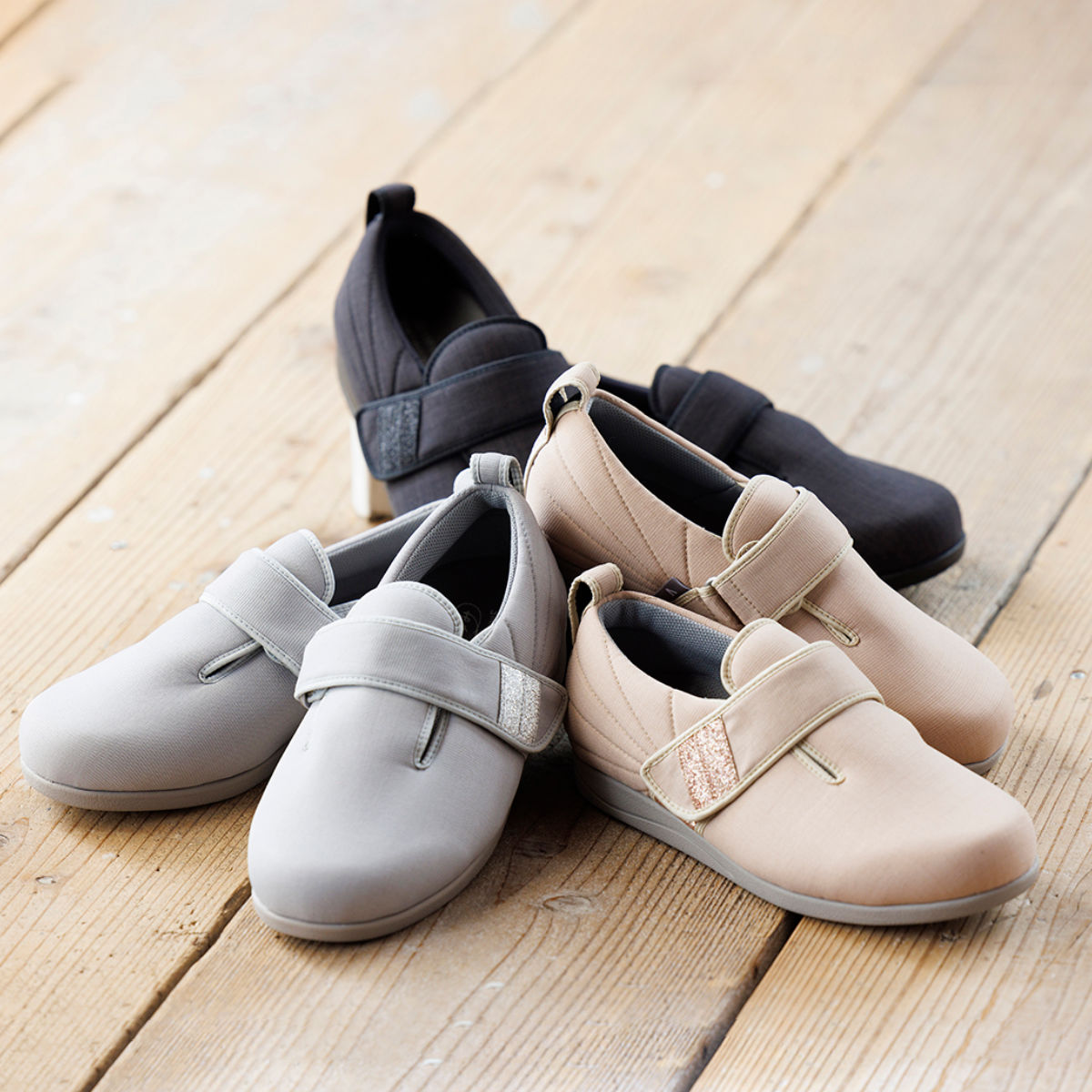 内素材がやわらかくベルトが甲全体に優しくフィットするので、むくみや腫れがあるときも、足の状態に合わせてベルトで調整できます。外反母趾の方や足ゆびに変形・痛みがある方、甲高の方にもおすすめです。ベルトは面ファスナーの調整によって+2cmまで延長できます。