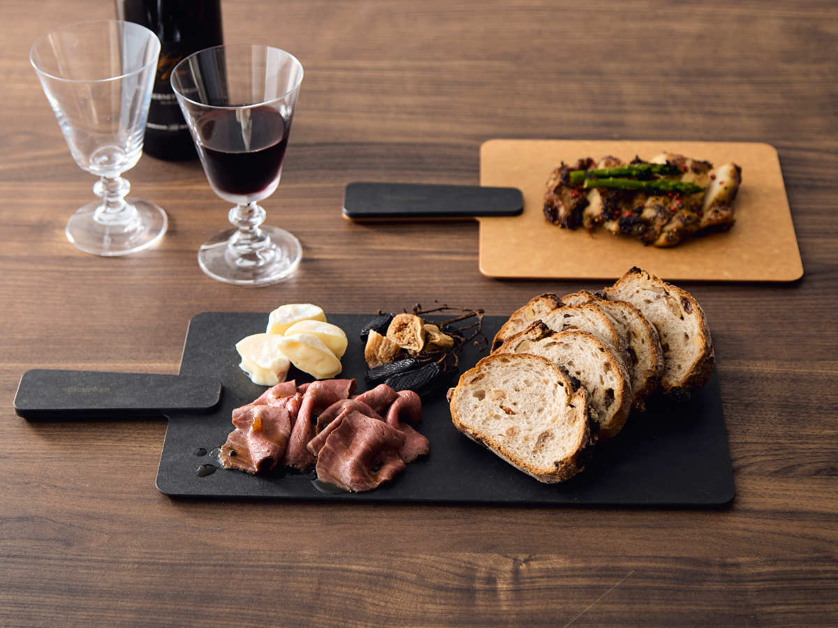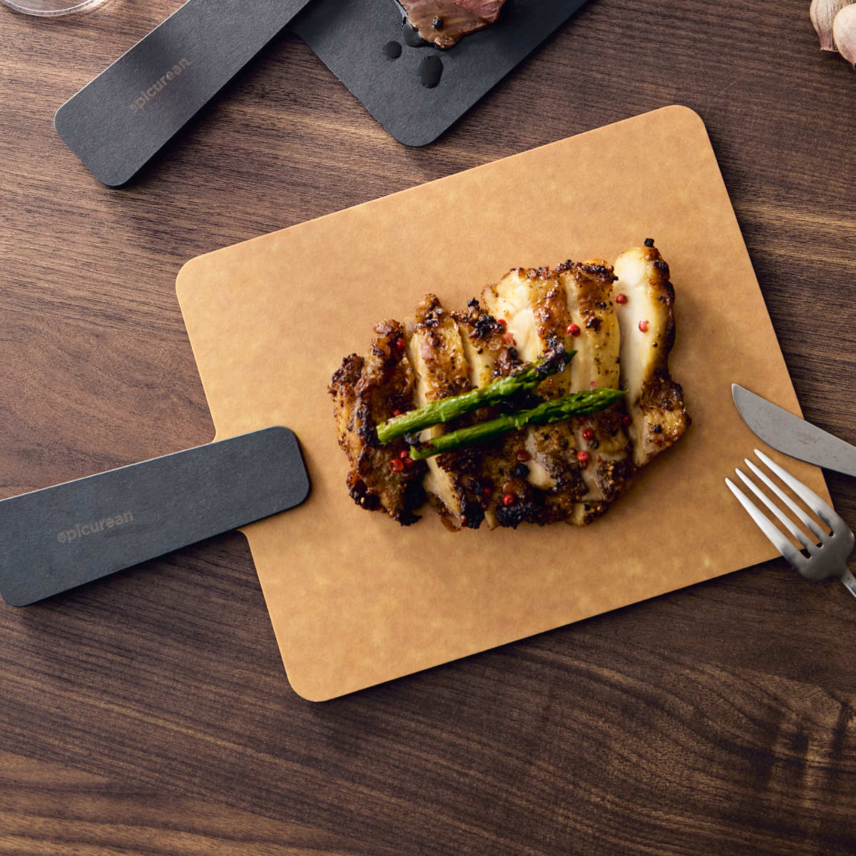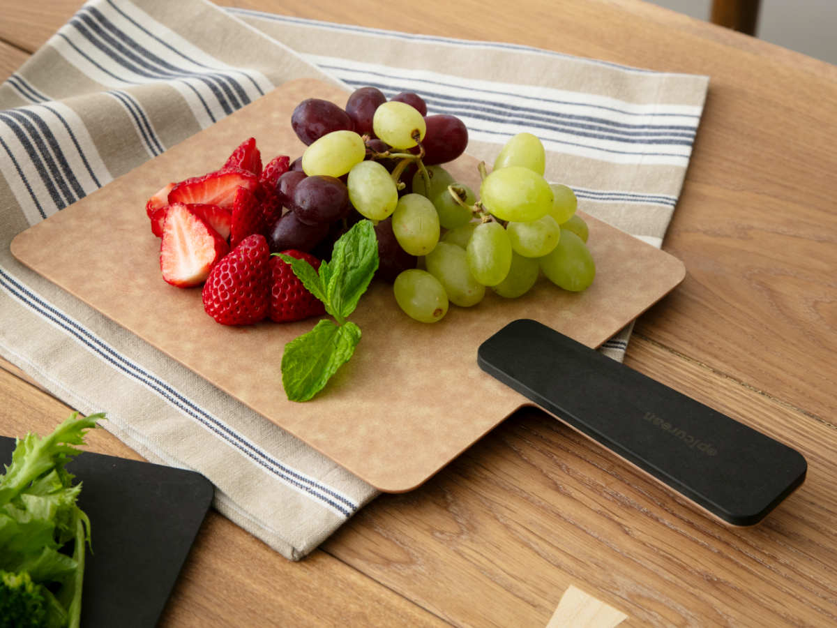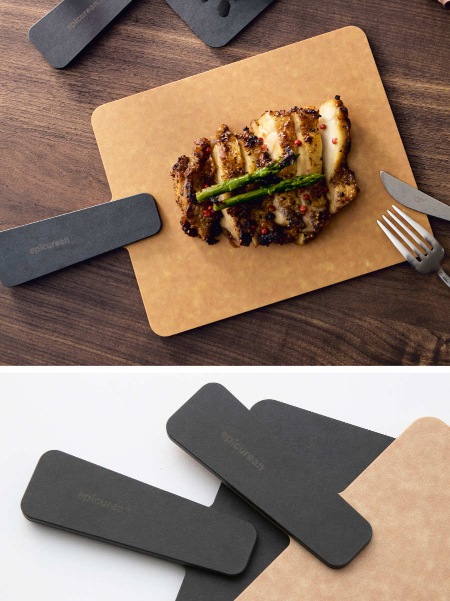 天然木の繊維を合成して作られ、耐久性に優れたエピキュリアン。軽くて薄く、機能性にも優れた使い勝手の良さが魅力です。ハンドルを付けることで、カットした食材を鍋に移したり、食卓へ持ち運びやすくなりました。