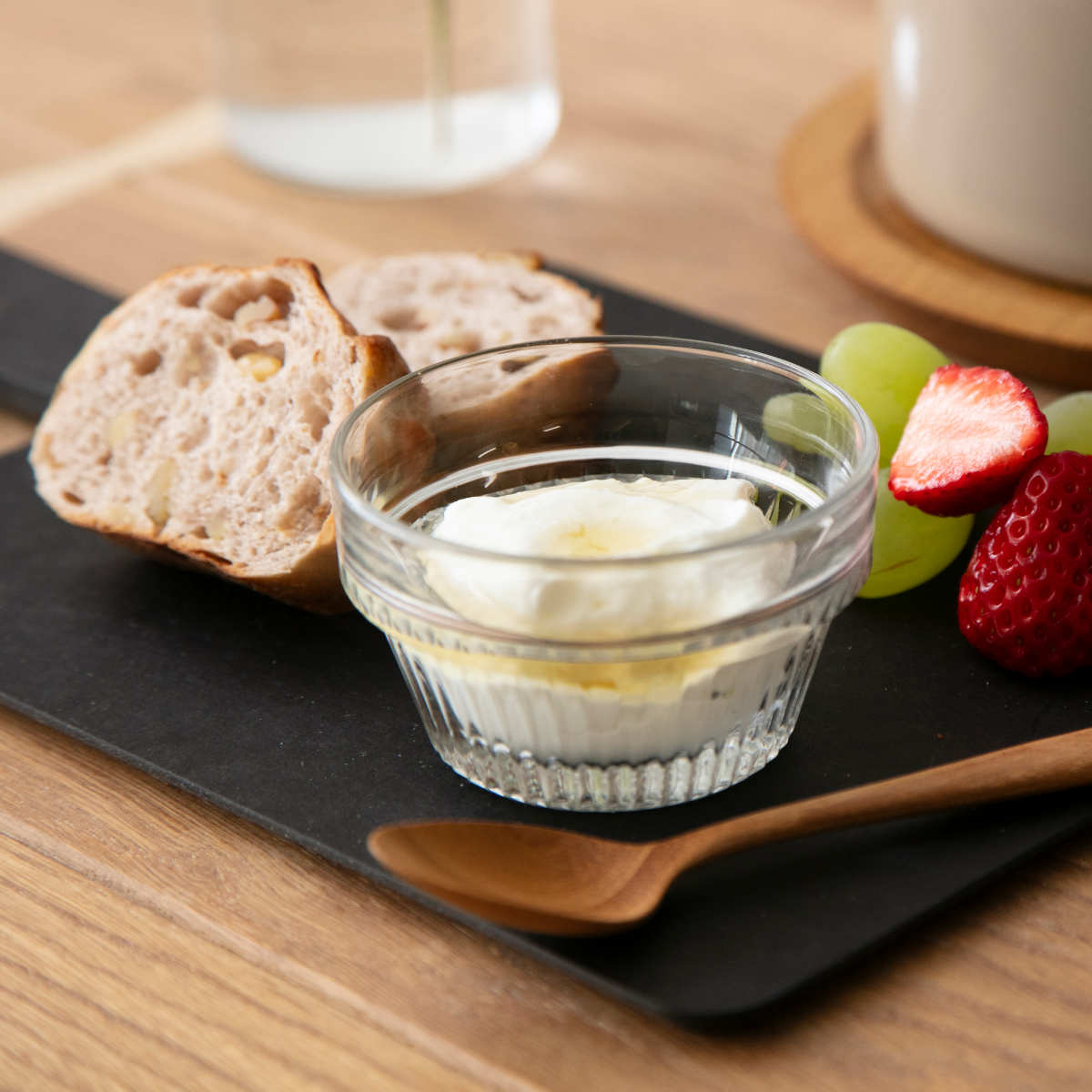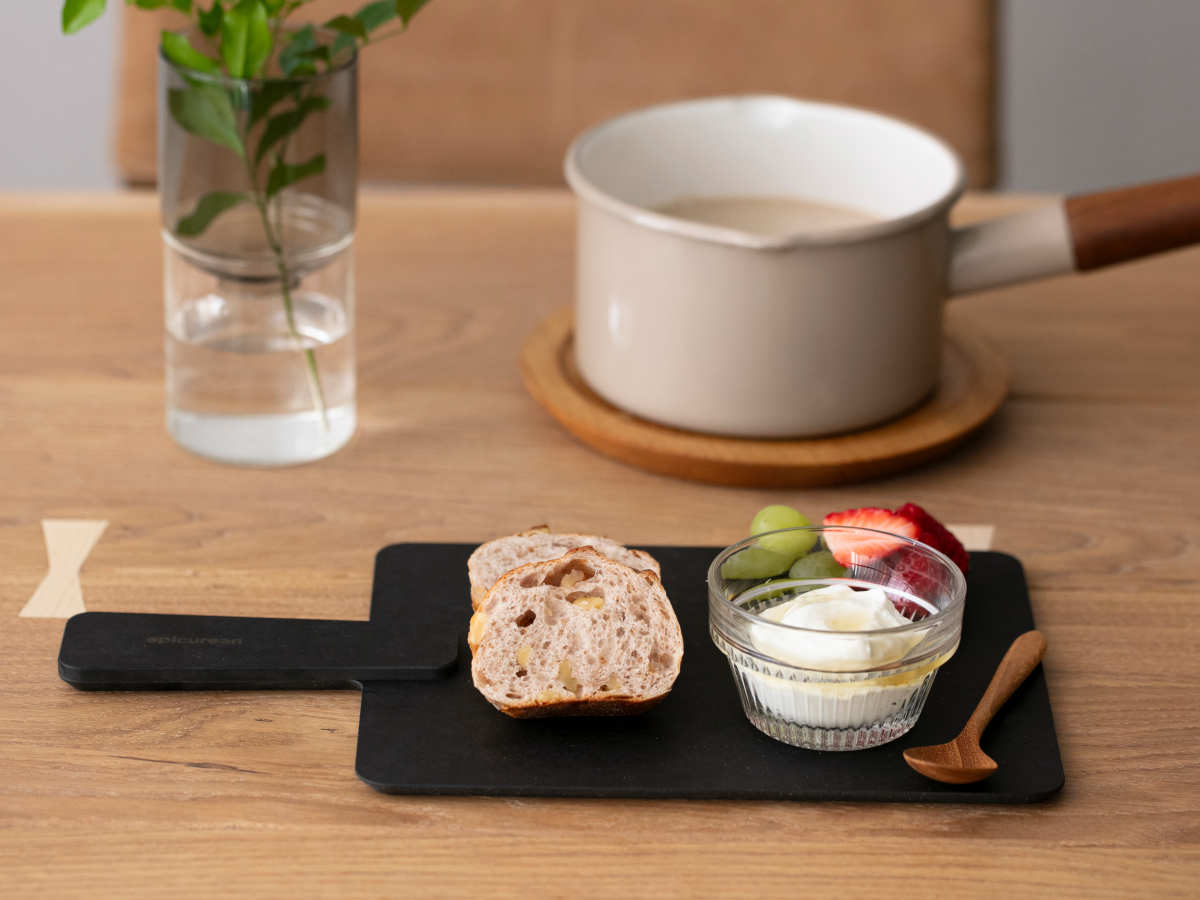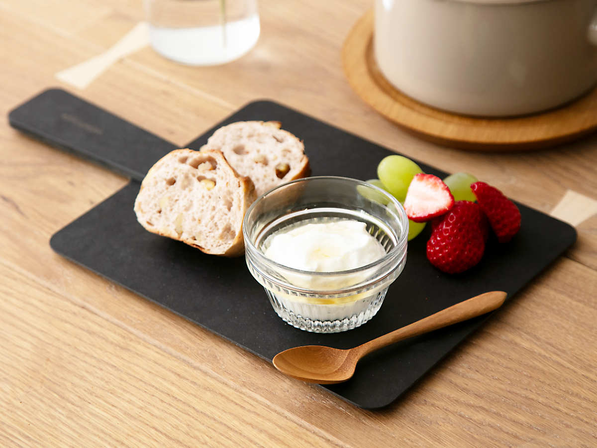 キッチンだけでなく、食卓でも活躍するシンプルなデザインです。パンや小鉢、カットしたフルーツをのせて朝食用プレートとして使用することができます。耐熱性が高いので、鍋敷きとしてもお使いいただけます。