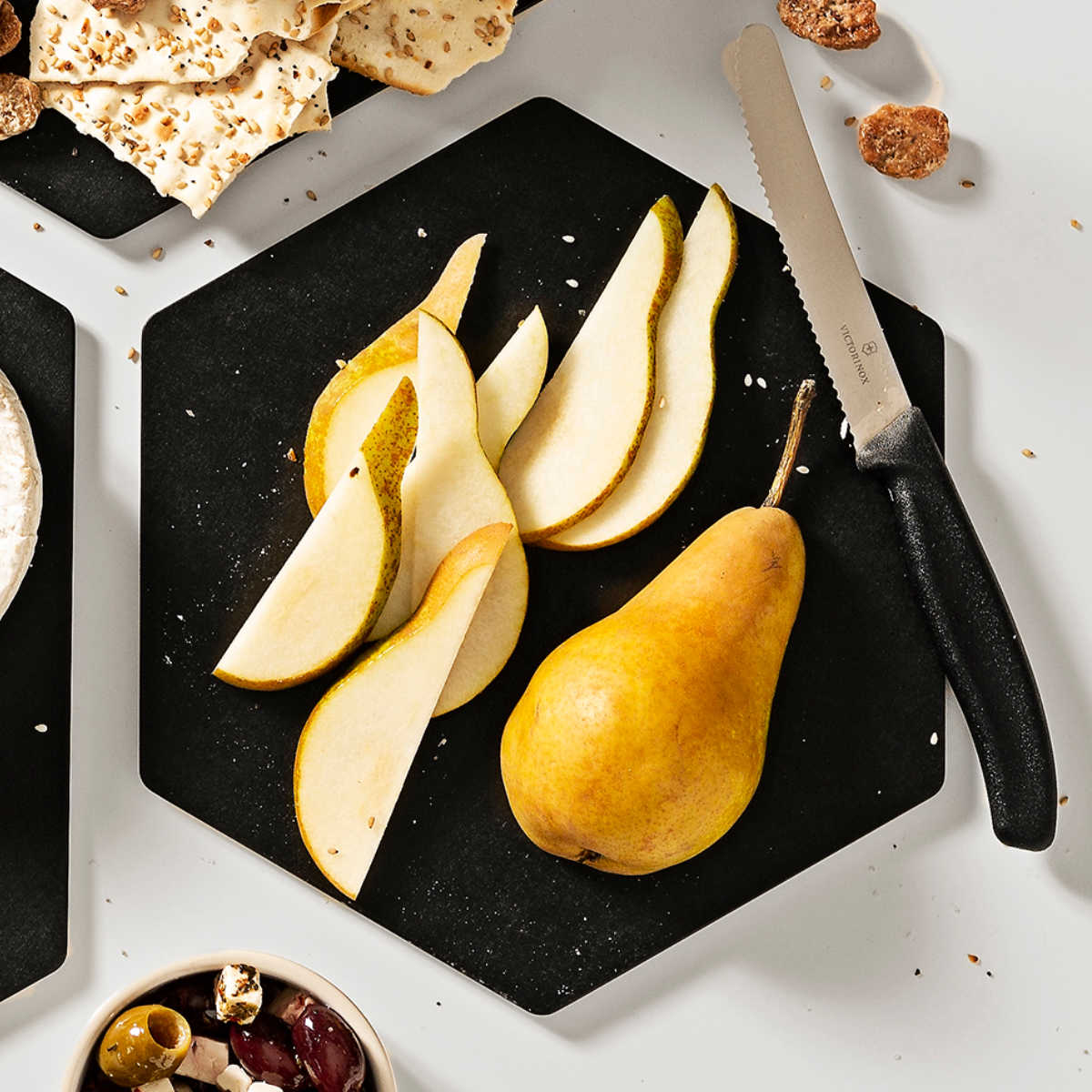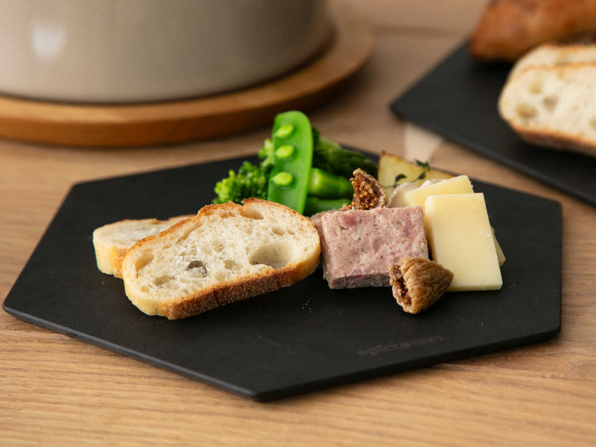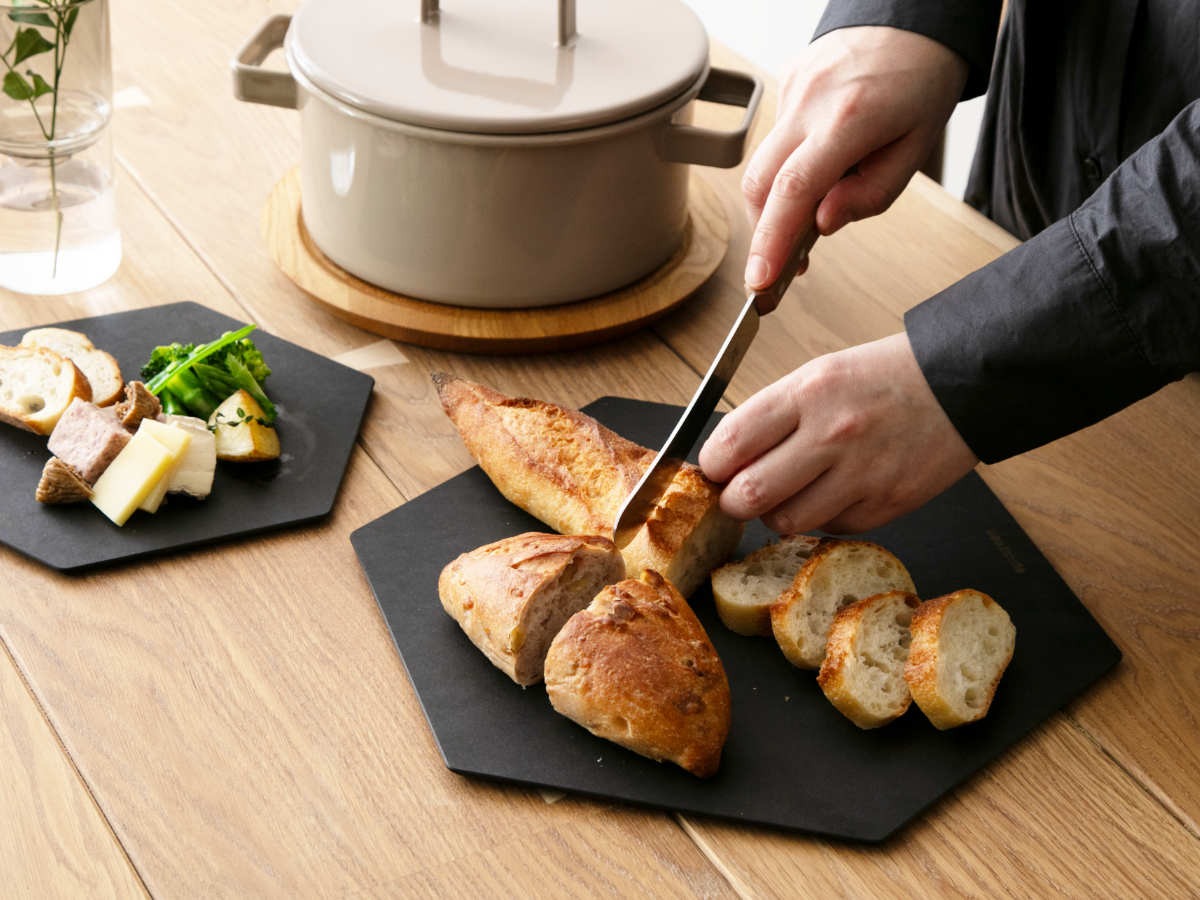 キッチンだけでなく、食卓でも活躍するデザインです。卓上でパンやチーズなどをサッとカットしてそのままプレートとしてお使いいただけます。耐熱性が高いので、鍋敷きとしてもお使いいただけます。