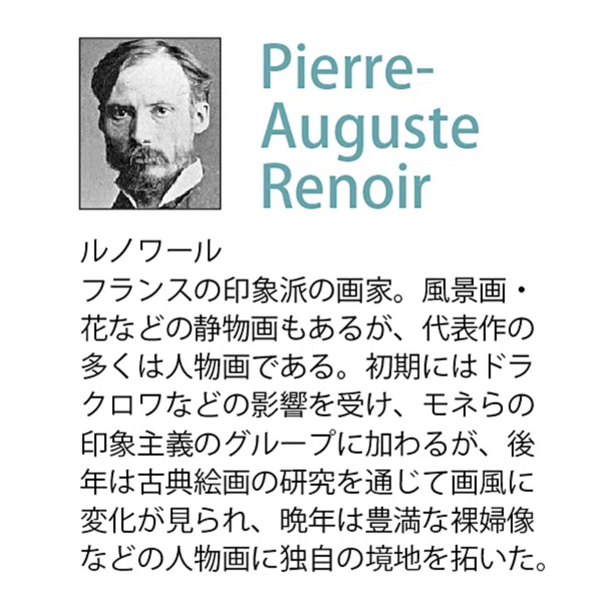 フランスの印象派の画家です。風景画や花などの静物画も手がけましたが、代表作の多くは人物画です。初期にはアングルやドラクロワなどの影響を受け、モネらの印象主義のグループに加わりましたが、後年は古典絵画の研究を通じて画風に変化が見られました。晩年には、豊満な裸婦像などの人物画に独自の境地を拓きました。