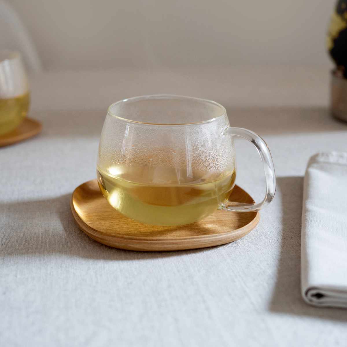 カジュアルに活躍するガラスカップと木製ソーサーのセット