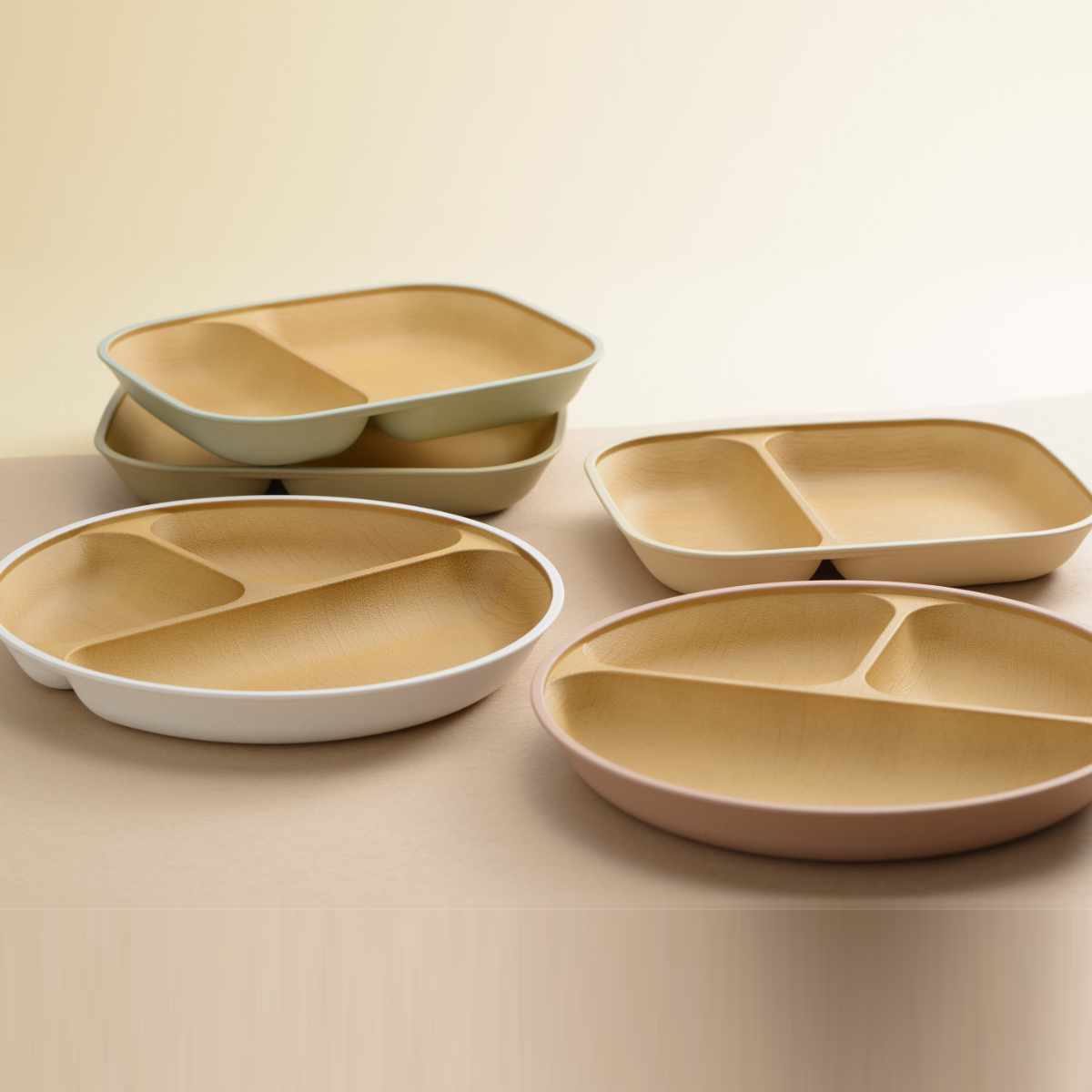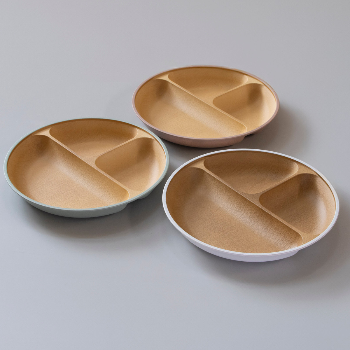 手軽なワンプレートランチ、サラダ・パン・デザートを乗せた朝食にもぴったりな3つの仕切りプレートです。外側の淡い色合いと内側の木目調カラーが優しく調和したデザインで、毎日使いに飽きがきません。