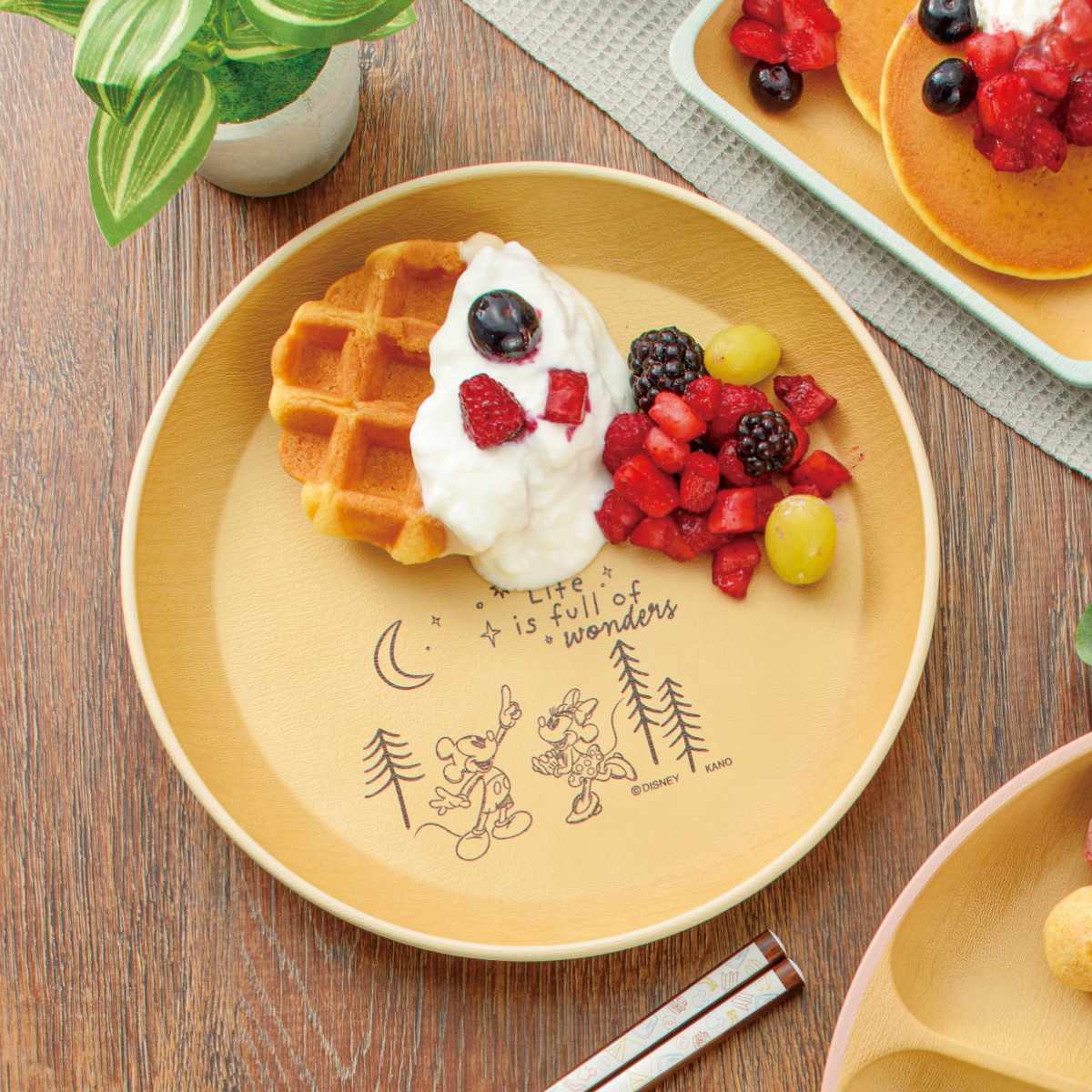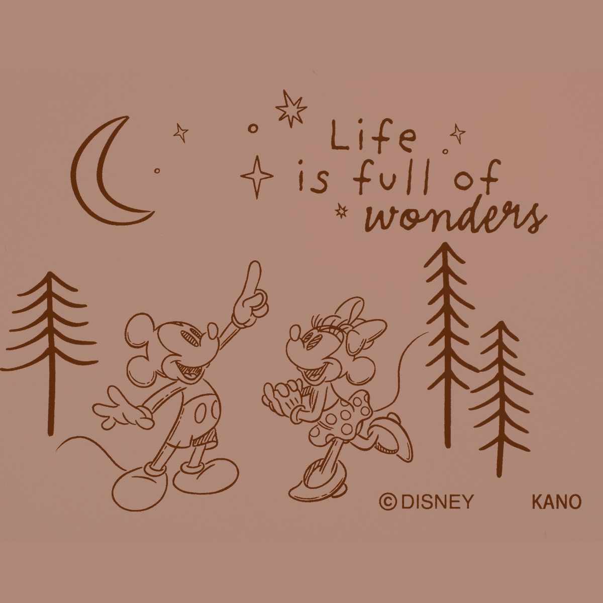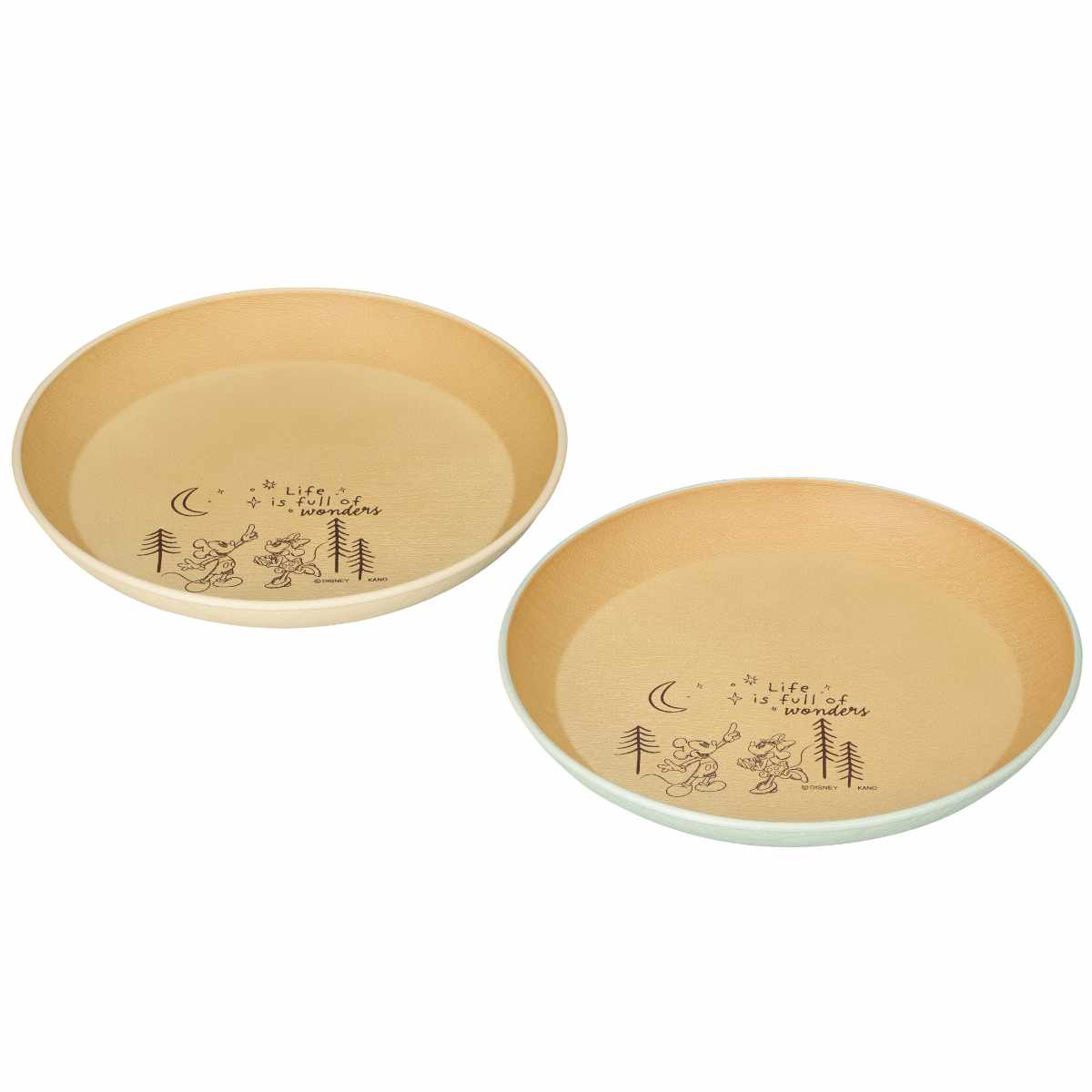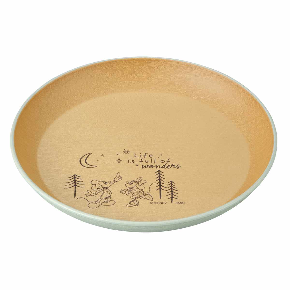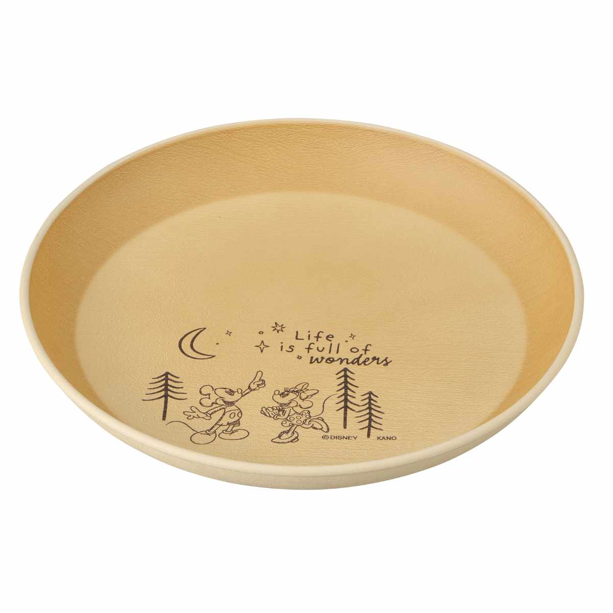 キャンプの夜、ミッキーとミニーが夜空を見て愉しくお話しているような風景がデッサン風に描かれています。主張することがないので盛り付けの邪魔はしません。外側の淡い色合いと内側が木目調カラーが優しく調和されていて毎日使いに飽きがこないです。
