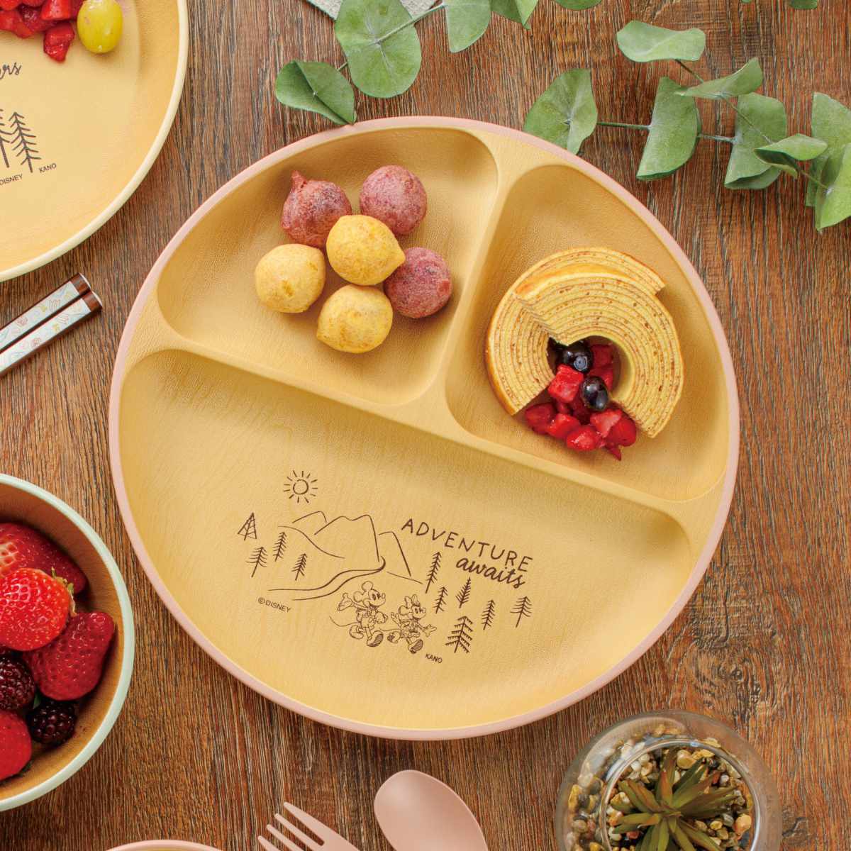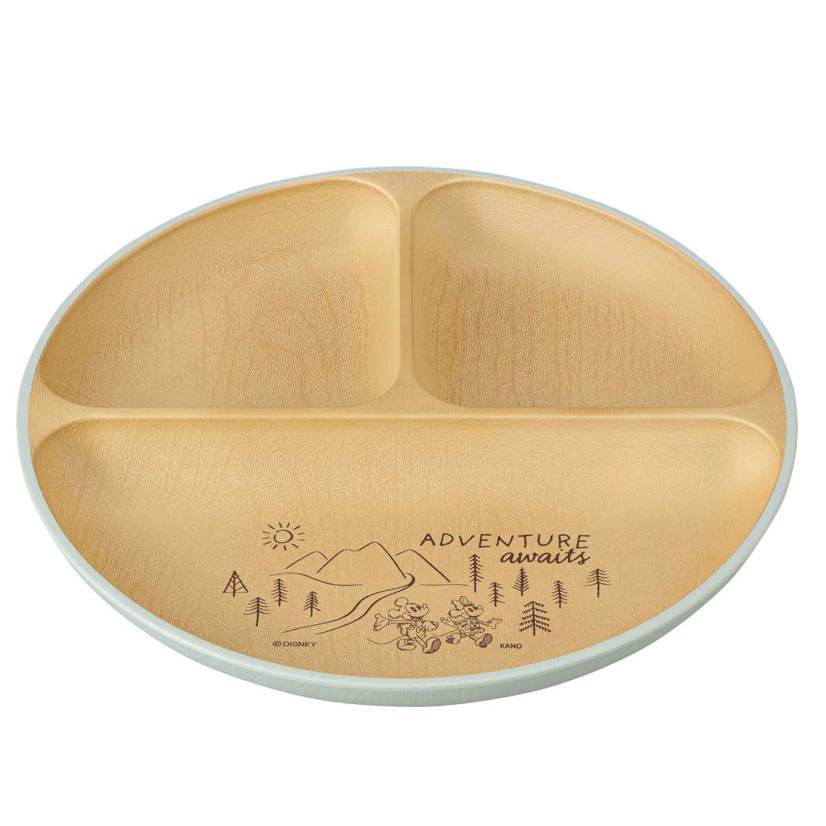 ミッキーとミニーがこれからキャンプに行くワクワクするような風景がデッサン風に描かれています。主張することがないので盛り付けの邪魔はしません。外側の淡い色合いと内側が木目調カラーが優しく調和されていて毎日使いに飽きがこないです。