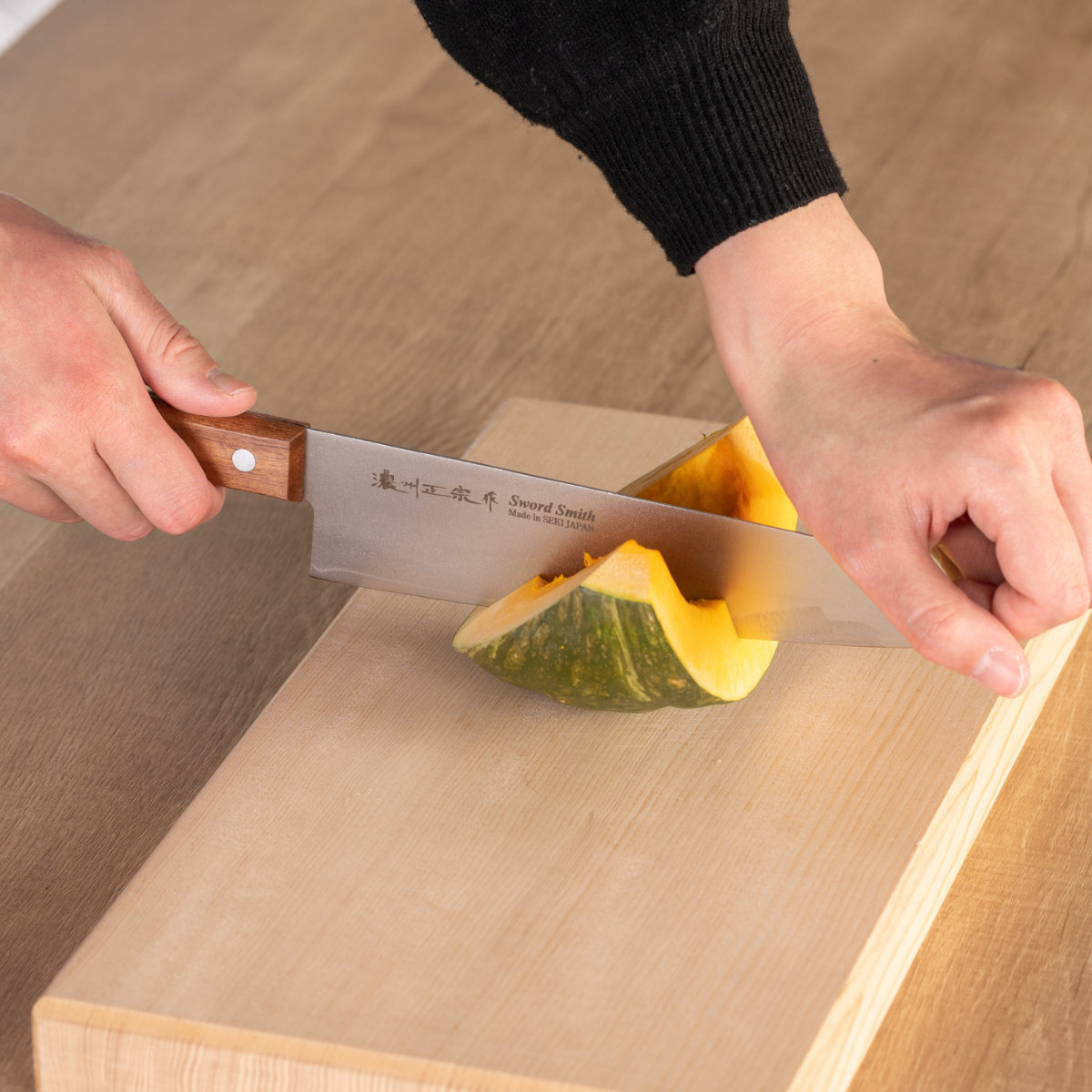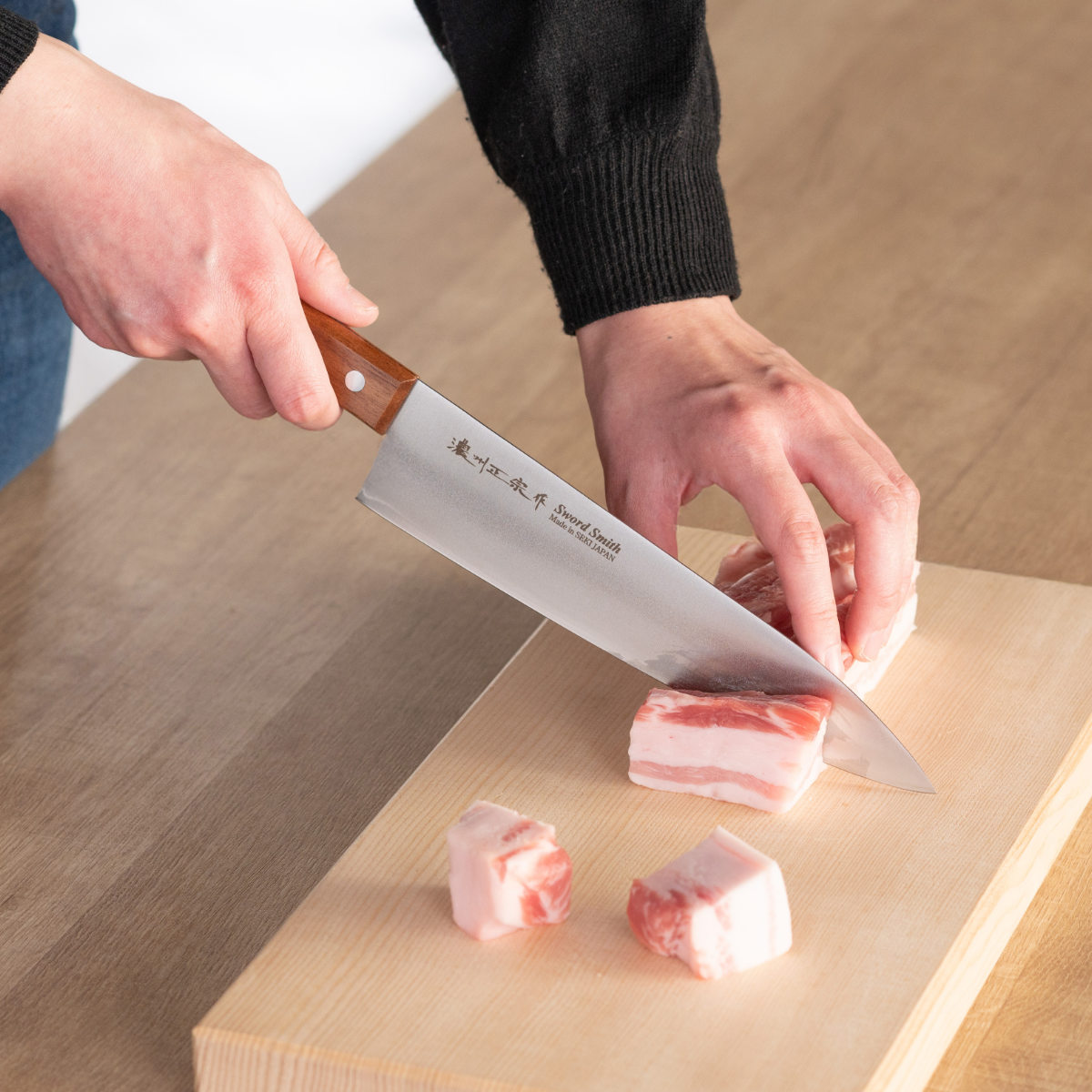 三徳よりも大きく、肉の切り分けや骨の切断、カボチャのような固い食材を切るのに適しています。肉や魚のカットはもちろんですが、キャベツの千切りや刺身の切り分けなど、広い用途にお使いいただけます。