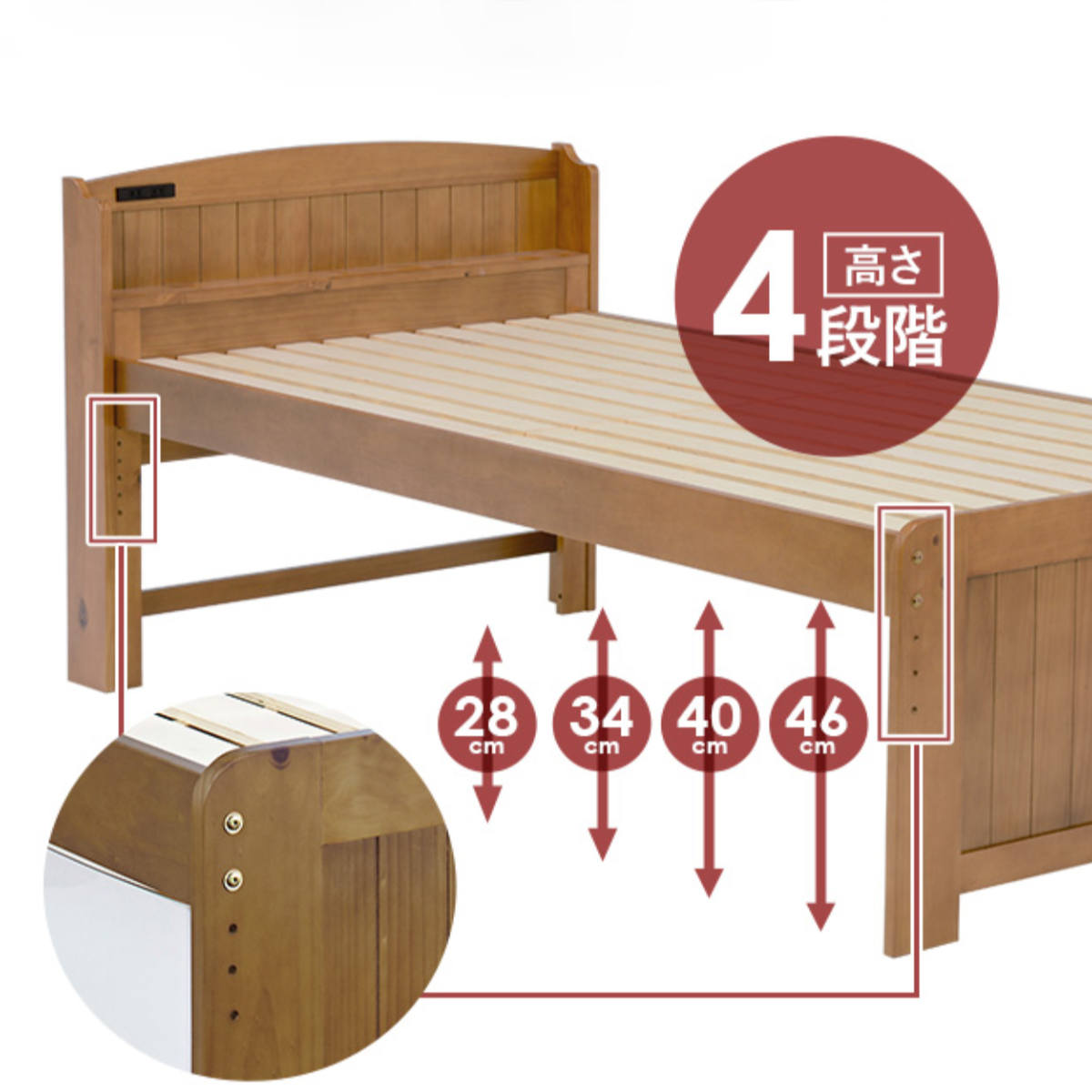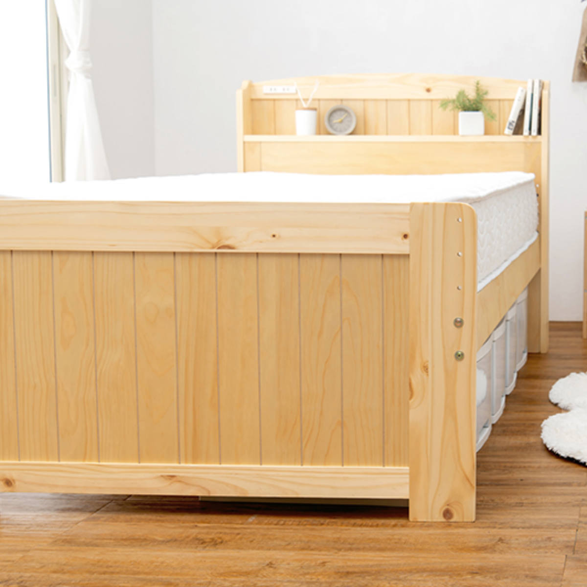 ベッド ボンネルマットレス付き シングル 宮棚 2口コンセント 敷き布団OK ( 高さ調節 圧縮梱包 マットレス付 すのこ 天然木 コンセント付 厚さ16cm 寝具 ナチュラル ライトブラウン ホワイトウォッシュ ) 【ナチュラル】