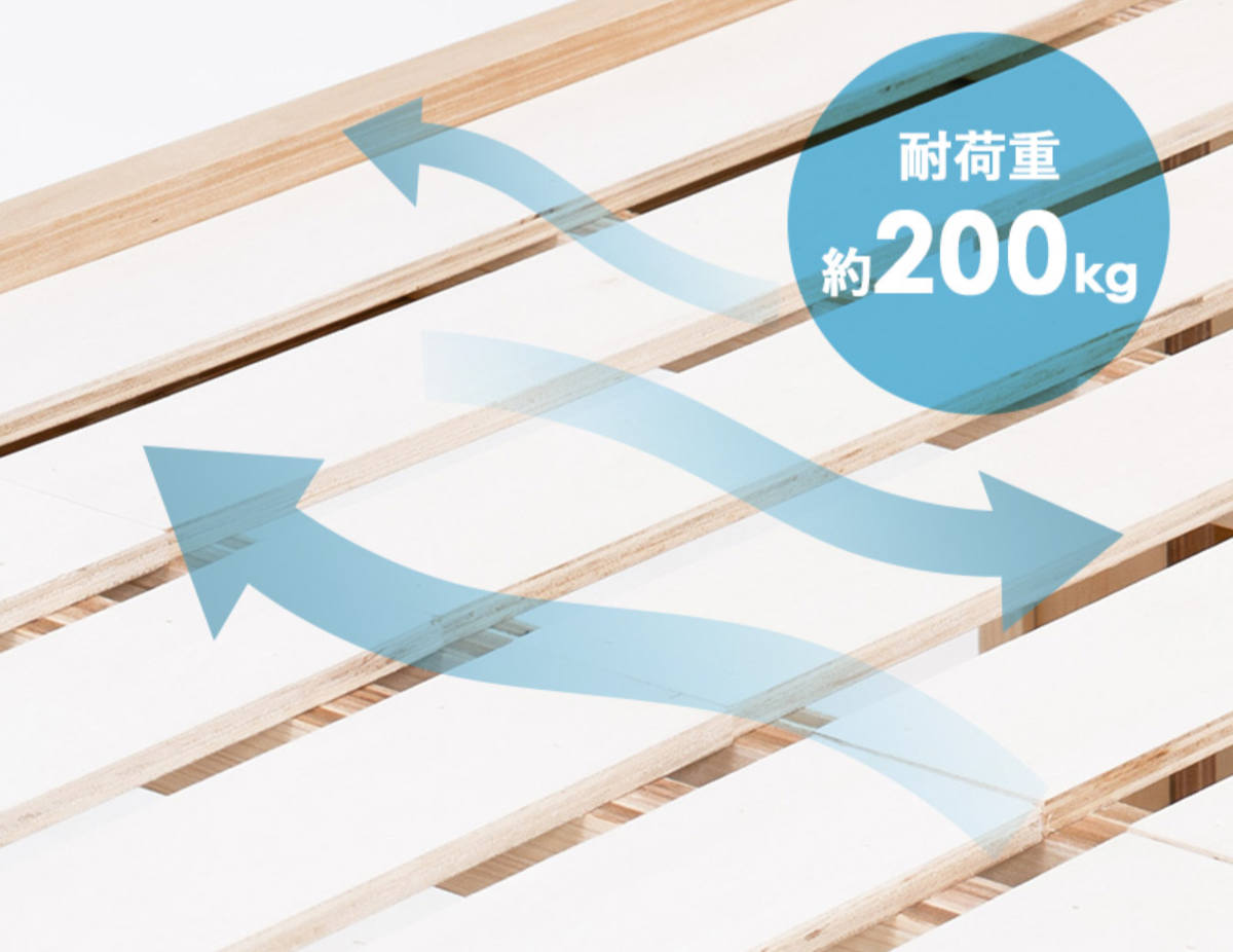 通気性抜群のすのこ板は汗や湿気を逃すので、布団やマットレスを清潔に保ちます。また、耐荷重は安心の200kgです。すのこを支える桟木の数を増やして強度を増した頑丈設計なので、小さなお子様から成人男性まで幅広くご使用いただけます。