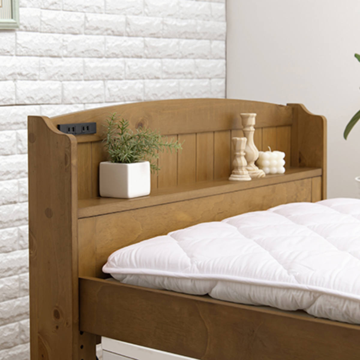 ヘッドボードはナチュラルなカントリー調のデザインです。眼鏡や目覚まし時計などベッド周りで必要な物をサッと置くことができます。また、二口コンセント付きなのでライトや就寝時の充電にも最適です。
