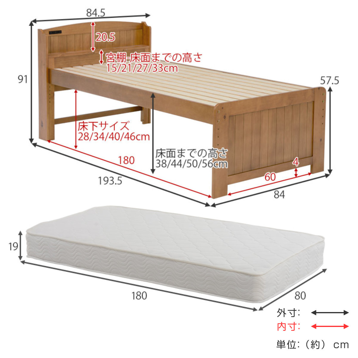 | サイズ | ベッド:幅84.5×奥行193.5×高さ91(cm) 床面高:38・44・50・56(cm)の4段階 マットレス:幅80×奥行180×高さ19(cm) |
