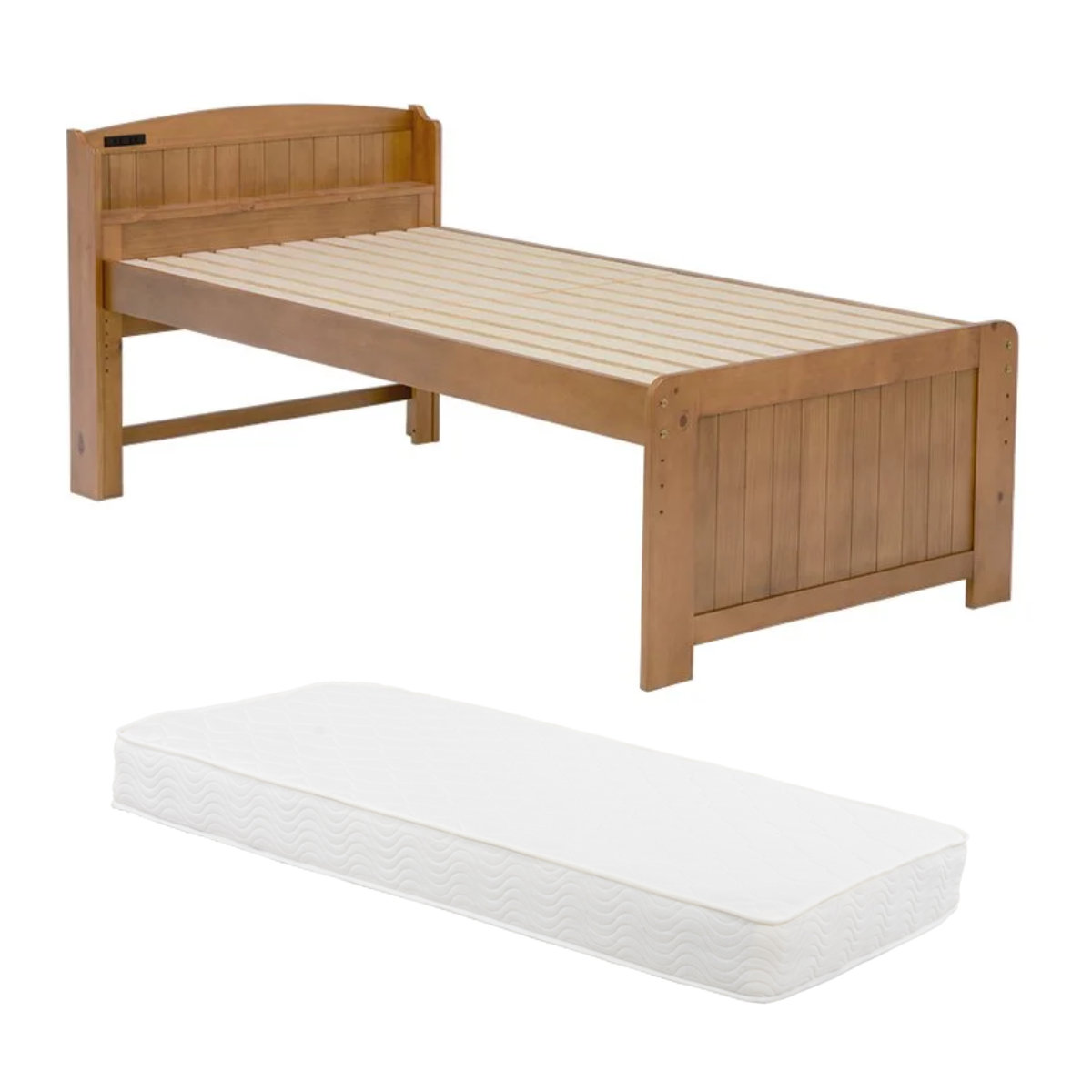 ベッド ポケットマットレス付き シングル 宮棚 2口コンセント 敷き布団OK ( 高さ調節 圧縮梱包 マットレス付 シングル すのこ 天然木 コンセント付 厚さ19cm 寝具 ナチュラル ライトブラウン ホワイトウォッシュ ) 【ライトブラウン】