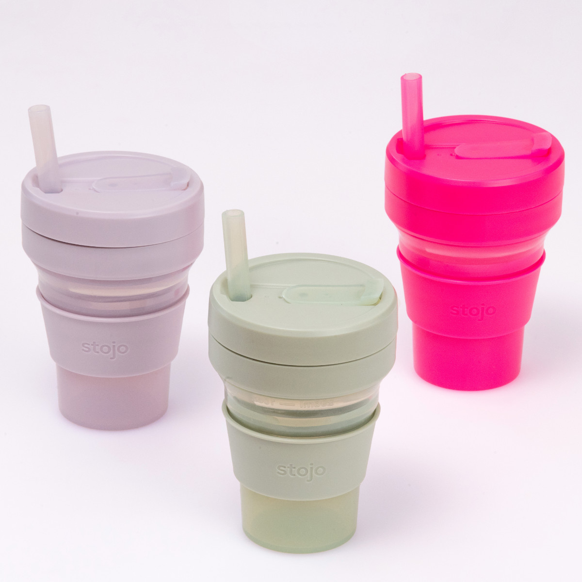 柔らかく口当たりのいいストロー付きで、ドライブ中や歩きながらでも飲みやすいです。ストローも折り畳んでカップ内に収納できます。