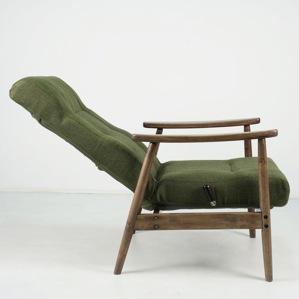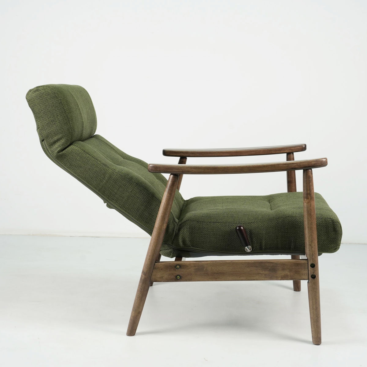 木肘の緩やかな曲線が美しいリクライニングチェアです。無段階リクライニング機能付きで、手元のレバーを使って、背もたれをお好みの角度に調節できます。読書をしたり、おいしいお茶を飲んだり、のんびりうたた寝したり…そんな贅沢な時間を過ごせるチェアです。
