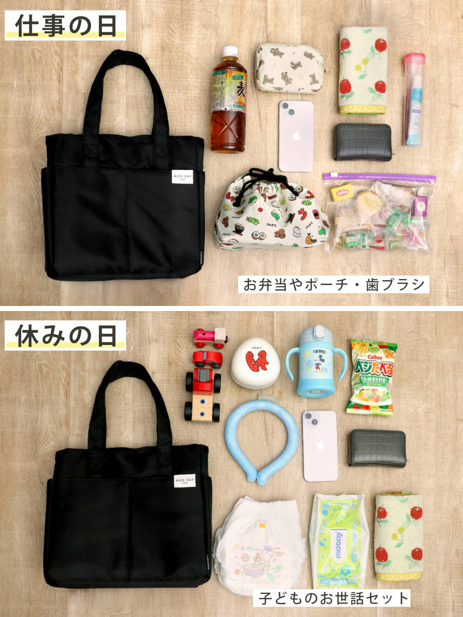 平日はママのランチバッグ、休日は子どものお世話バッグにも。オムツやおやつ、マグボトルまでしっかり入ります。