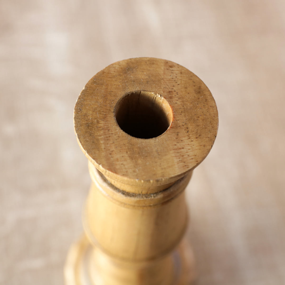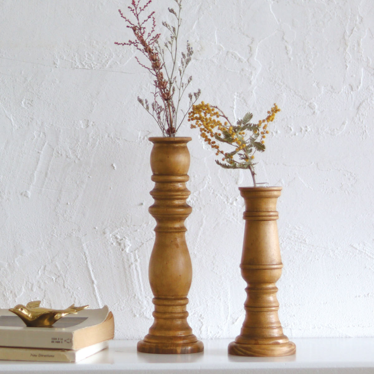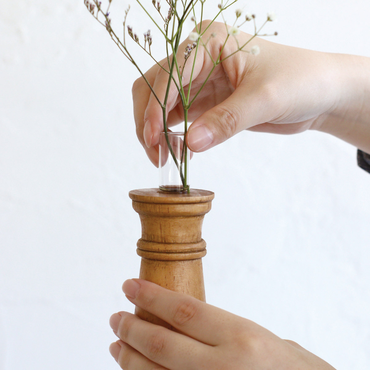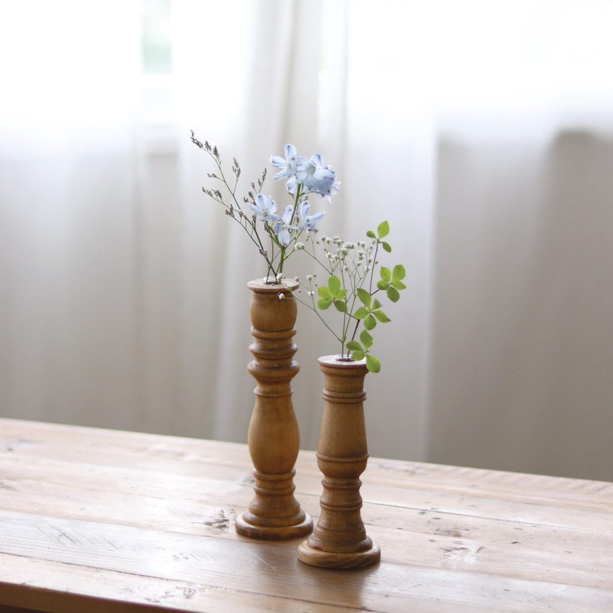 アンティークのような雰囲気のある木製の一輪挿し Lサイズです。素材には天然木パイン材を使用しており、自然な風合いがどんなインテリアにも自然に溶け込んでくれます。コンパクトなサイズ感で玄関やデスクなど限られたスペースにも飾りやすいです。