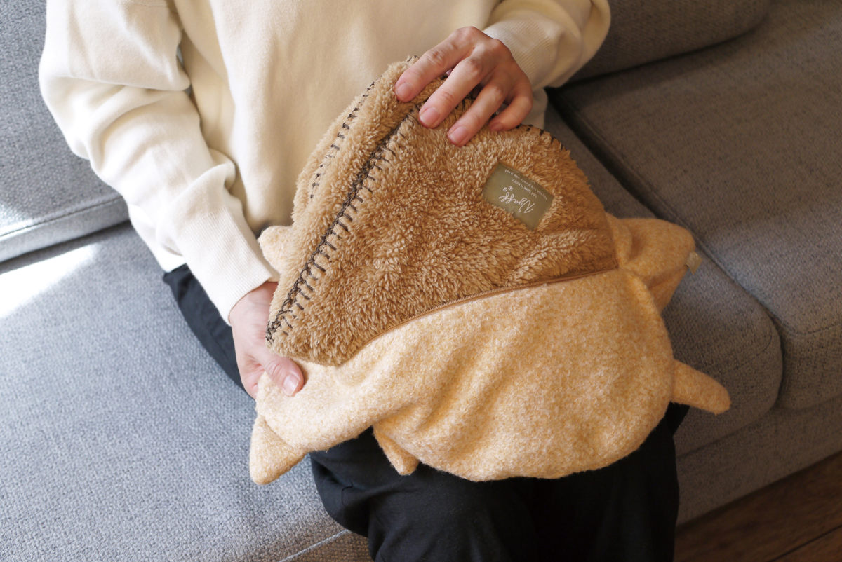 猫のカバーの背中に付いたファスナー部分から簡単に出し入れができます。シーズンオフで収納場所に困るブランケットも、カバーに入れておけばクッションとして年中活躍します。