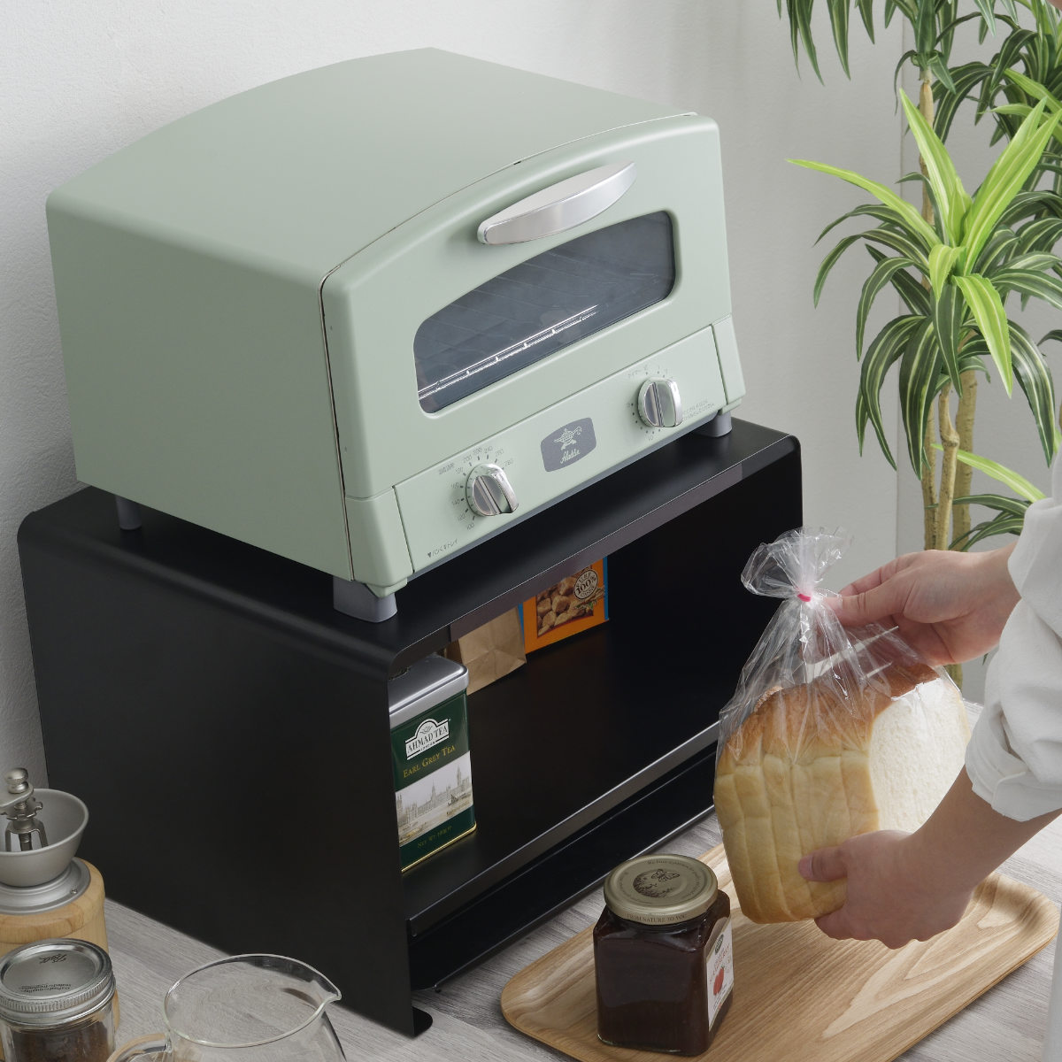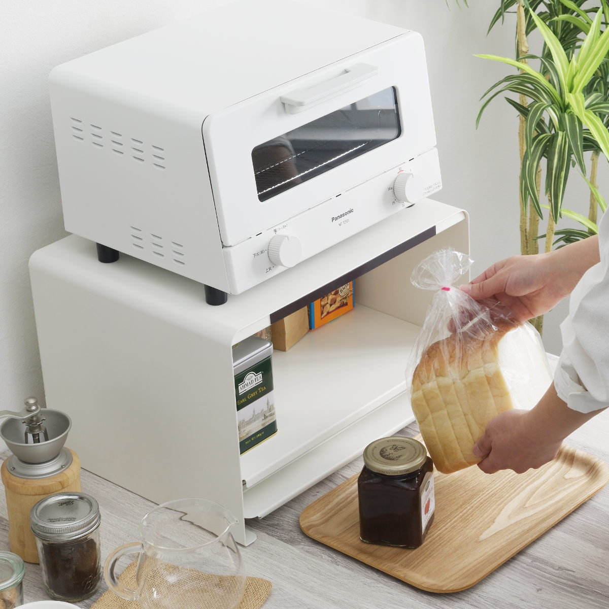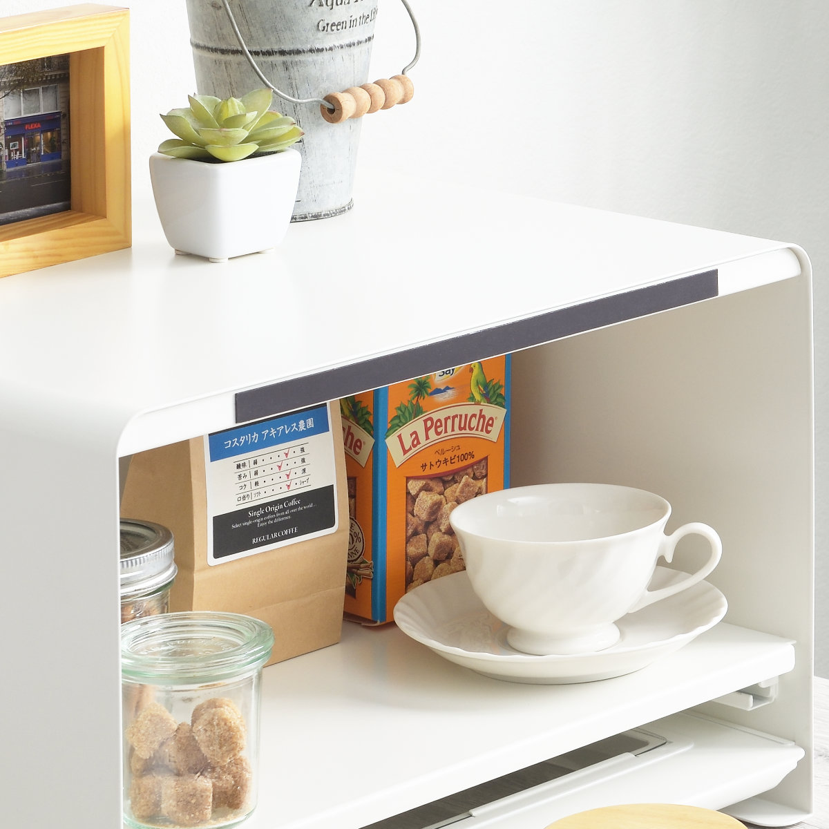 広い天板には、ケトルやマグカップを並べるのはもちろん、小型のトースターやホットサンドメーカーなどを置くことができます。限られたカウンターのスペースを無駄にせず、収納量を増やしてすっきり整頓できます。