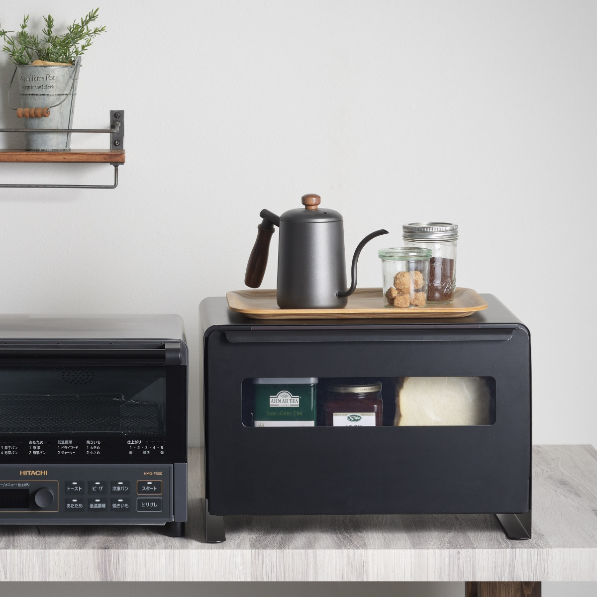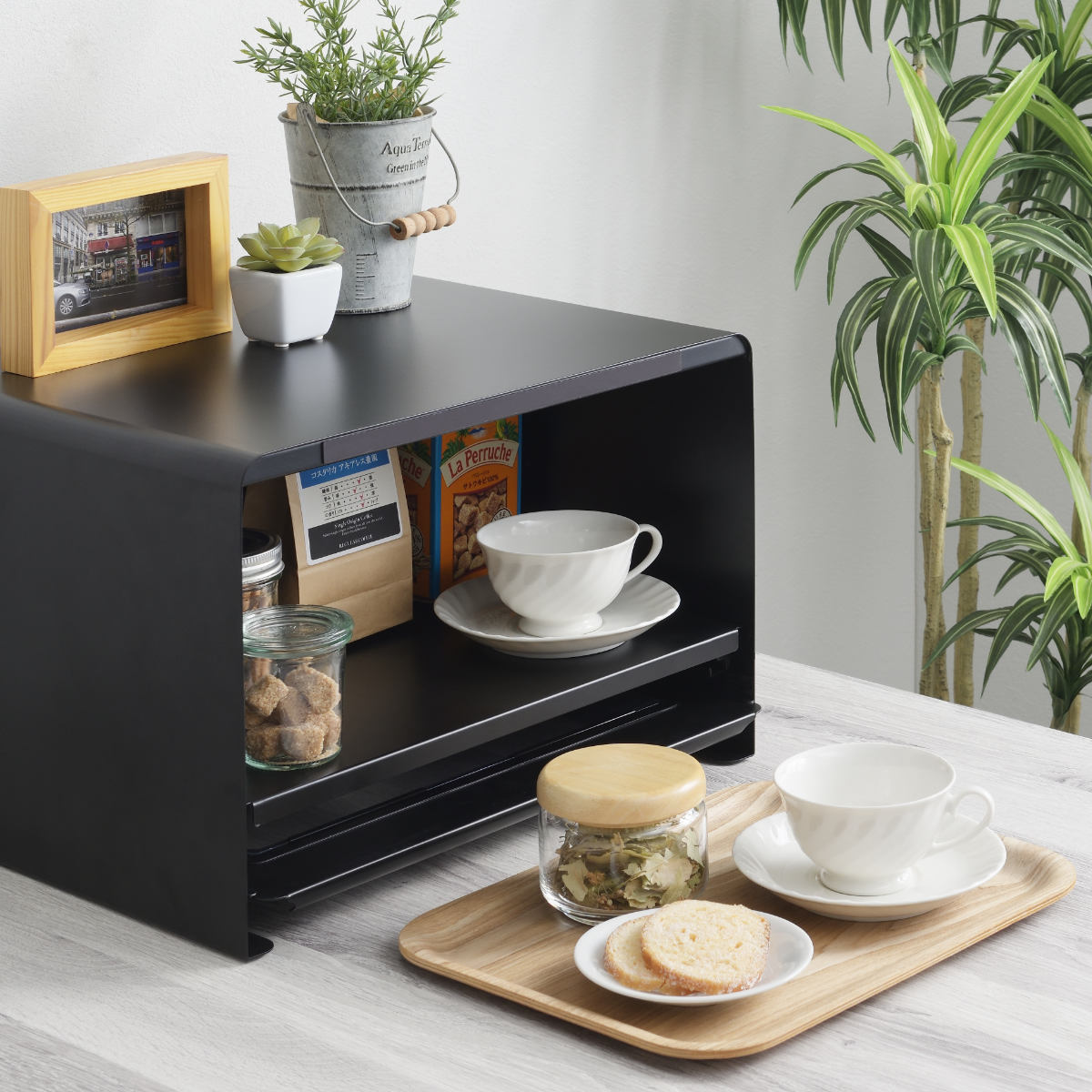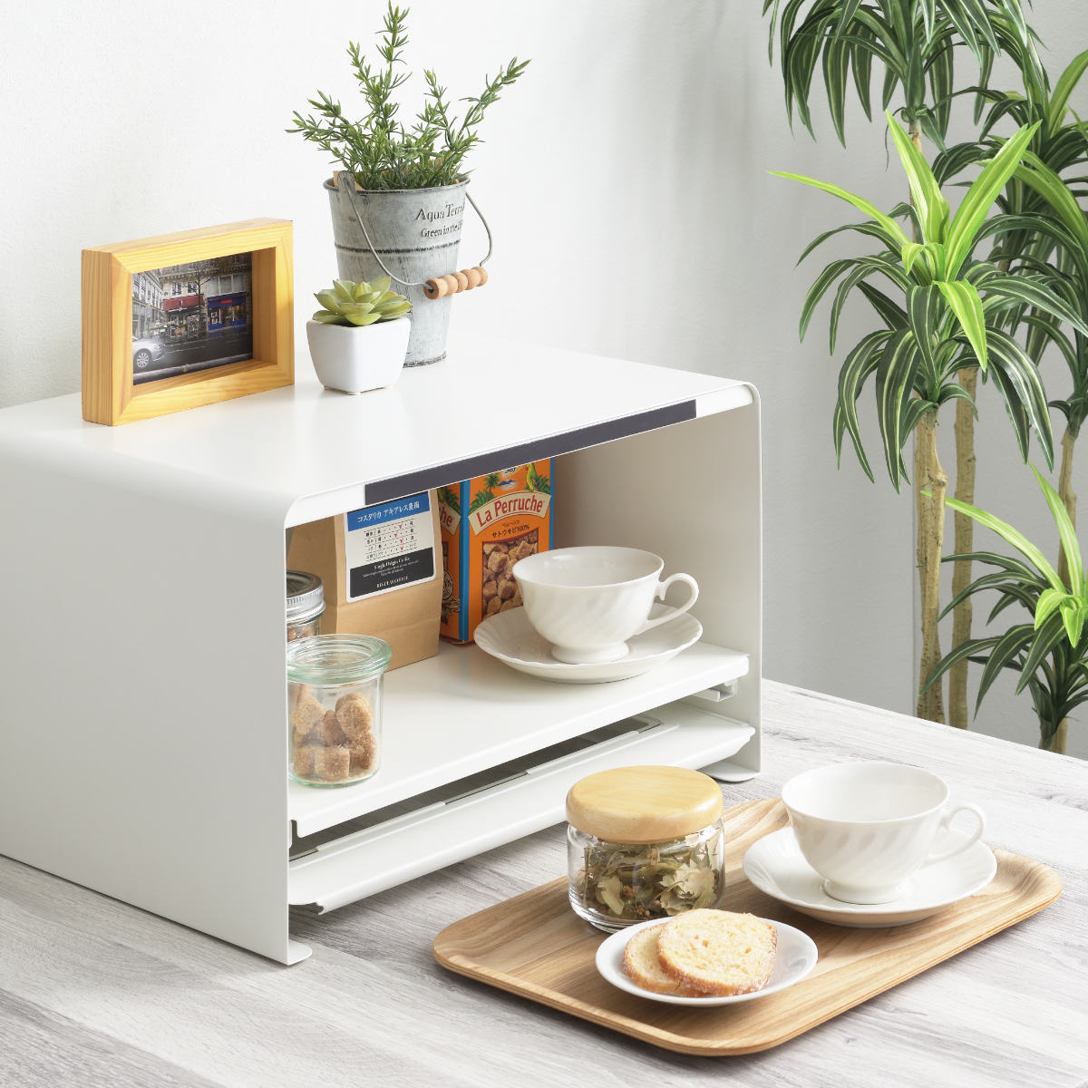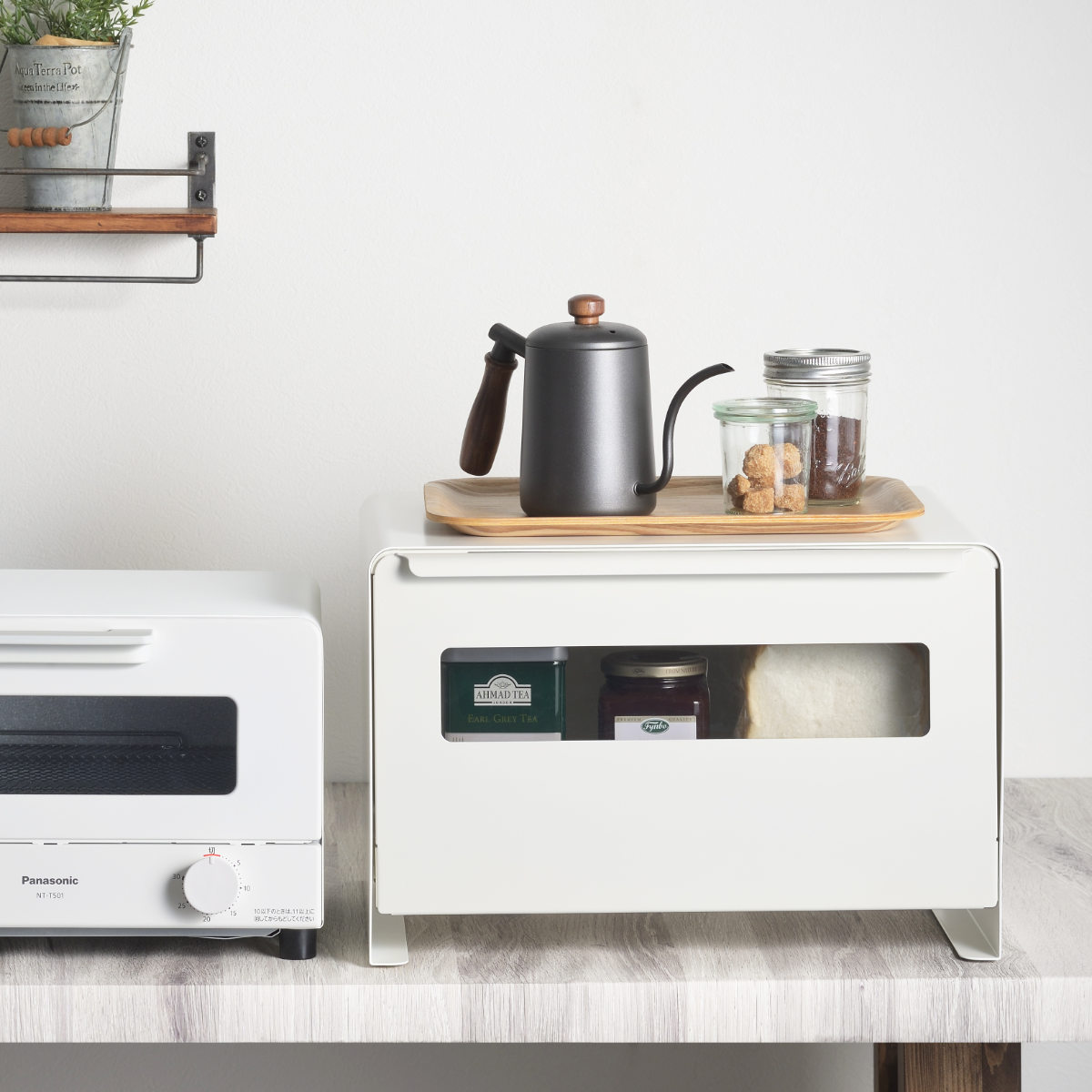 パンやジャム、カップやコーヒー用品などをすっきりまとめて収納できるブレッドケースです。キッチンカウンターなどで収納場所が決まらず雑然としがちな物を隠しながら美しく収納できます。