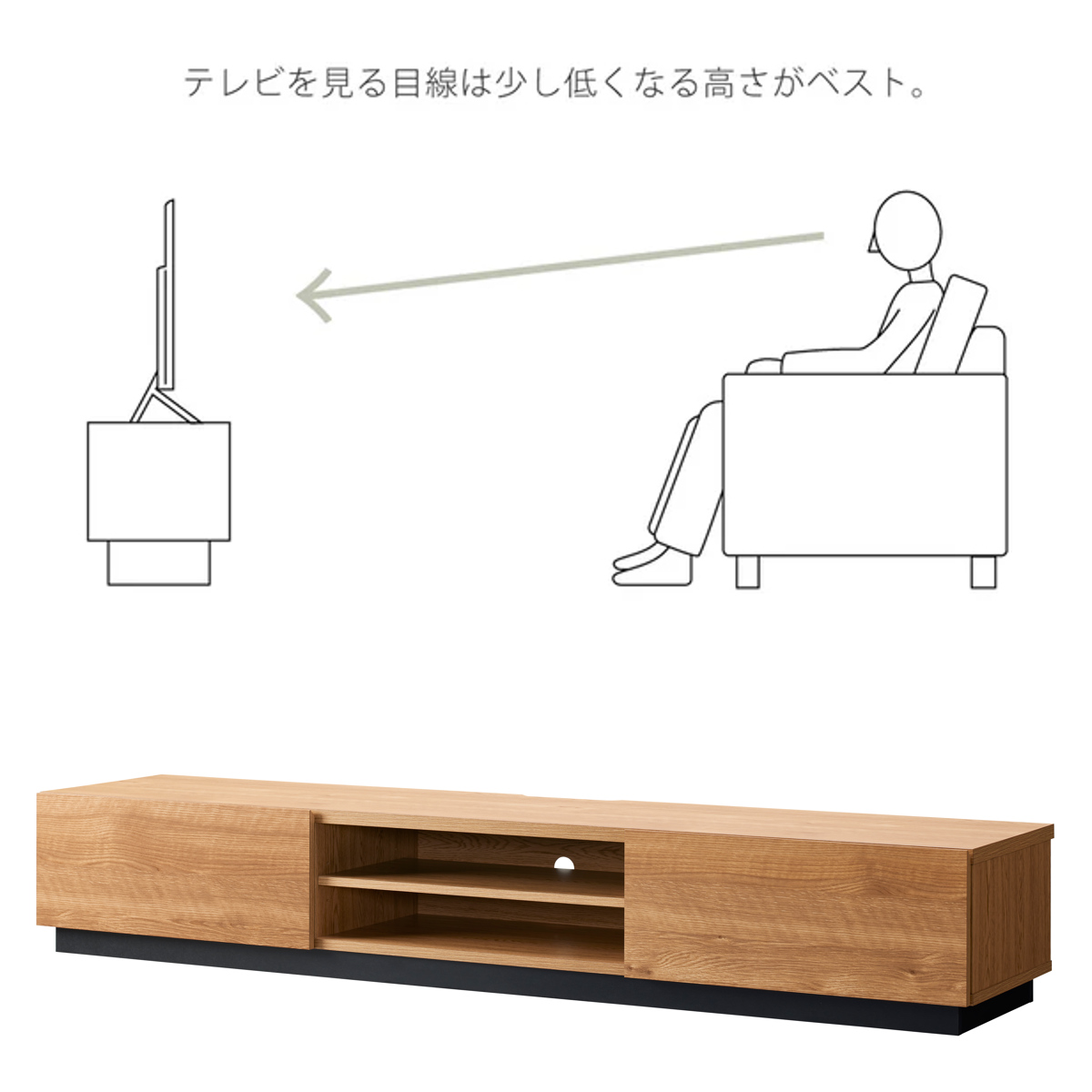 圧迫感が少なく、お部屋を広々と見せるロータイプです。テレビを見る目線が下がるため、ソファに座った状態でも肩や首に力を入れずに自然な姿勢で視聴できます。