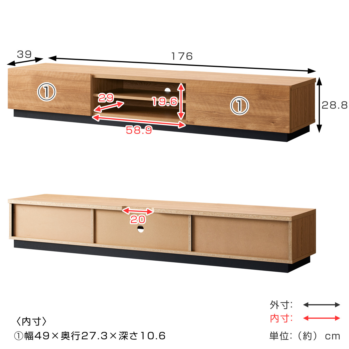 | サイズ | 約 幅176×奥行39×高さ28.8(cm) |