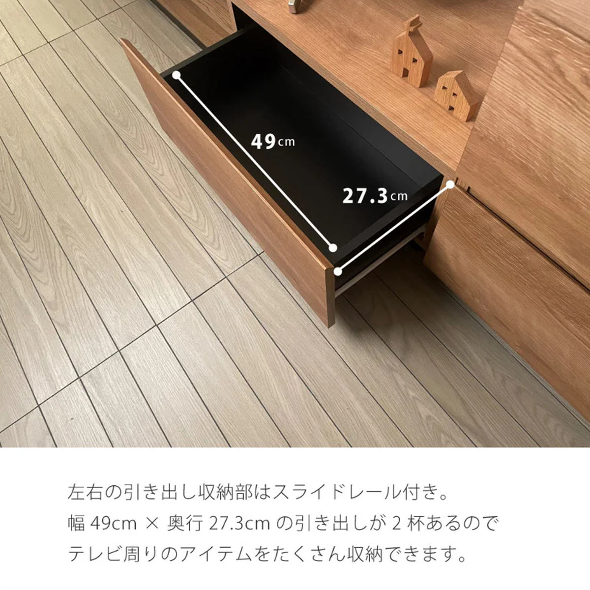DVD・小物類の収納に便利な引出しです。レール付きなのでたっぷり収納しても軽い力で引き出せます。