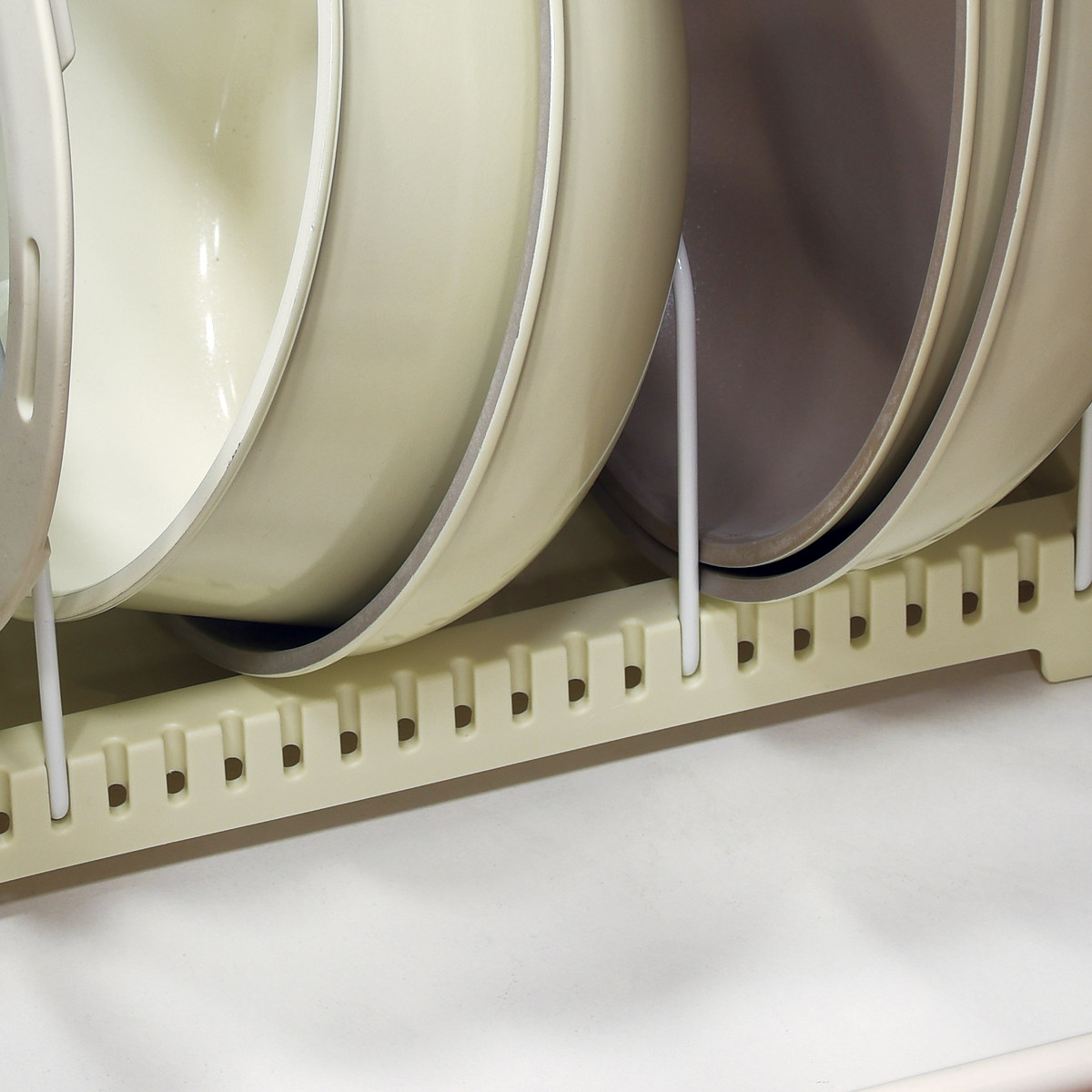 仕切りは細かく自由に調整することができ、収納幅が自在に変えられるので、薄型のフライパンから深型の鍋まで幅広く収納できます。