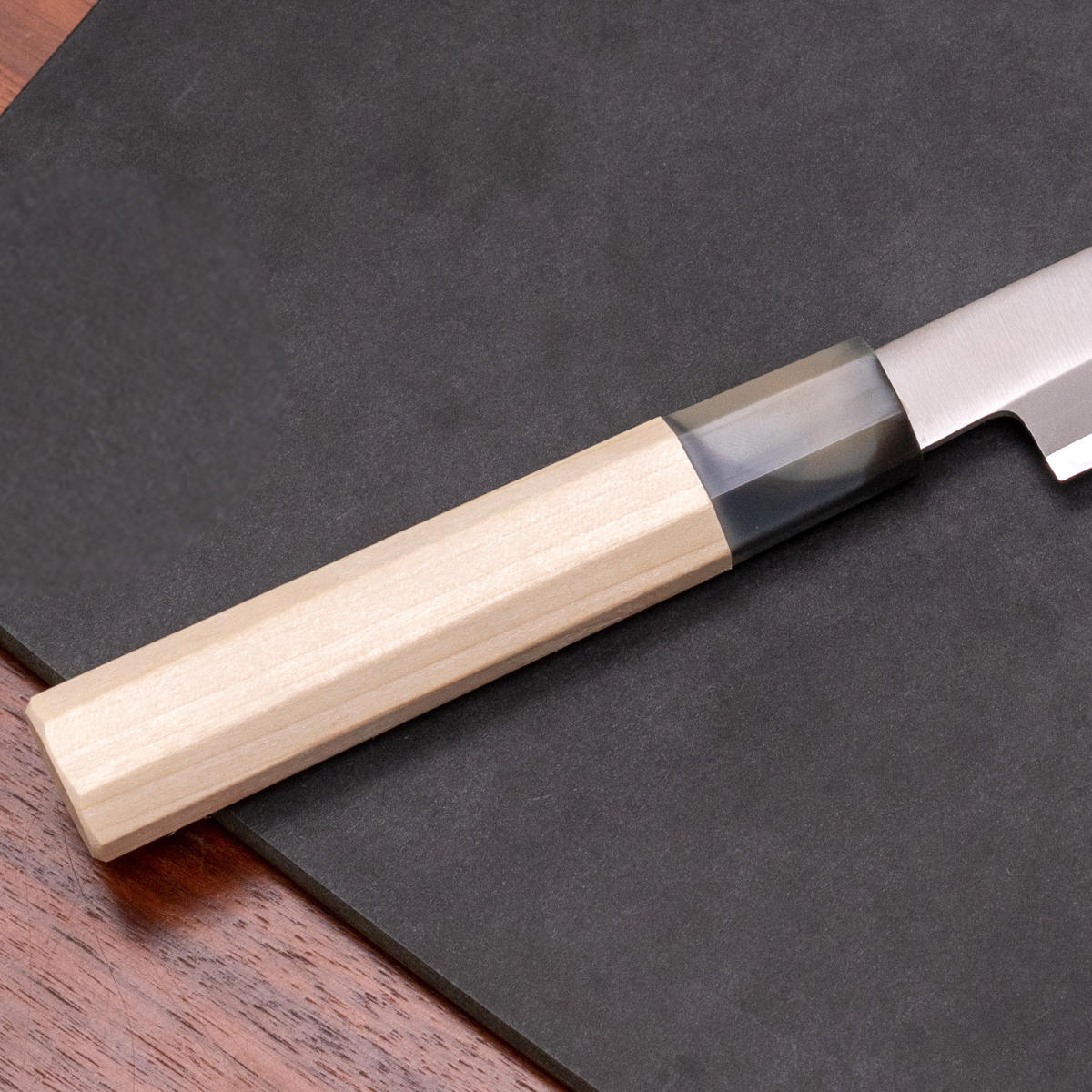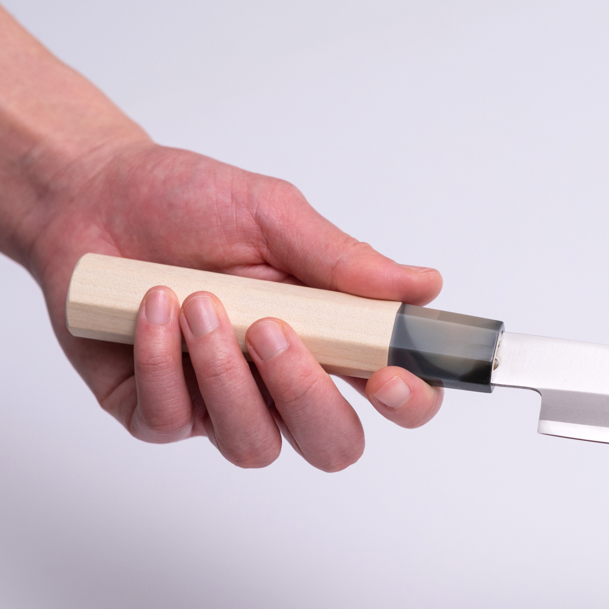 天然木を使用した、八角ハンドルの和包丁です。八角ハンドルは握りやすく滑りにくいため、手にかかる負担を和らげてくれるのが特長です。また、そのすっきりとしたフォルムは見た目にも美しく、シャープな雰囲気を醸し出します。