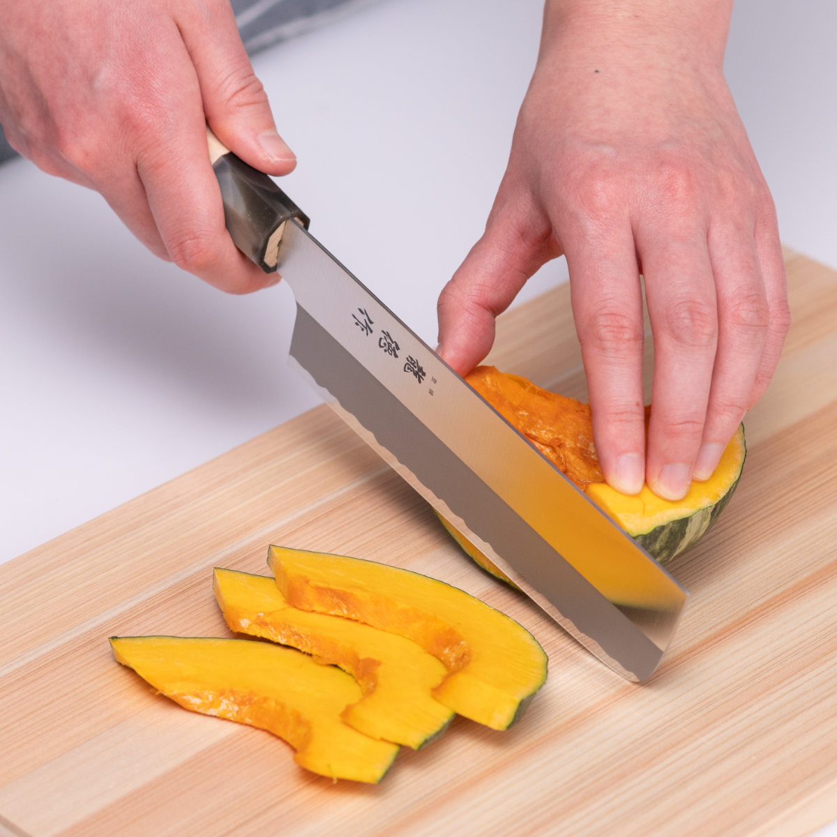 天然木を使用した、八角ハンドルの和包丁です。八角ハンドルは握りやすく滑りにくいため、手にかかる負担を和らげてくれるのが特長です。また、そのすっきりとしたフォルムは見た目にも美しく、シャープな雰囲気を醸し出します。