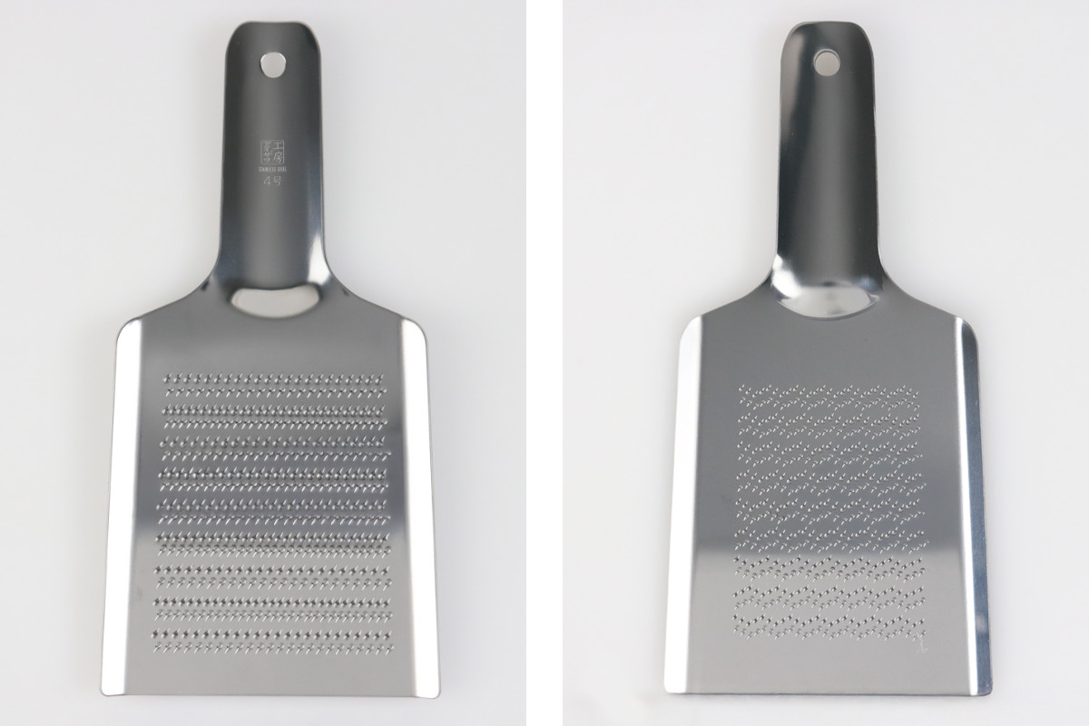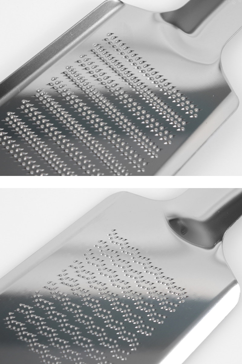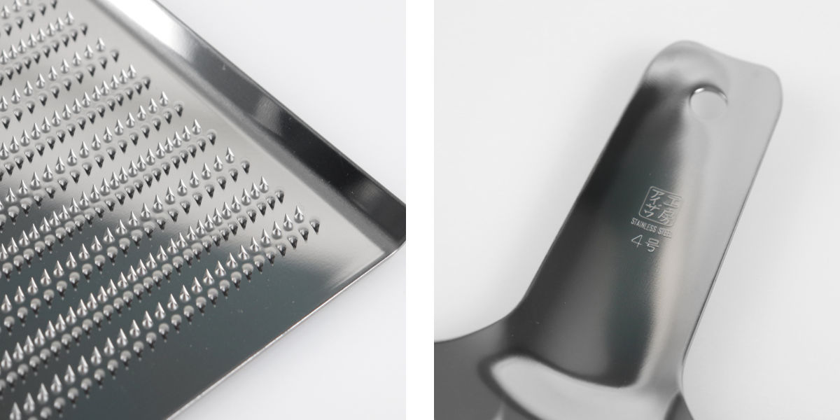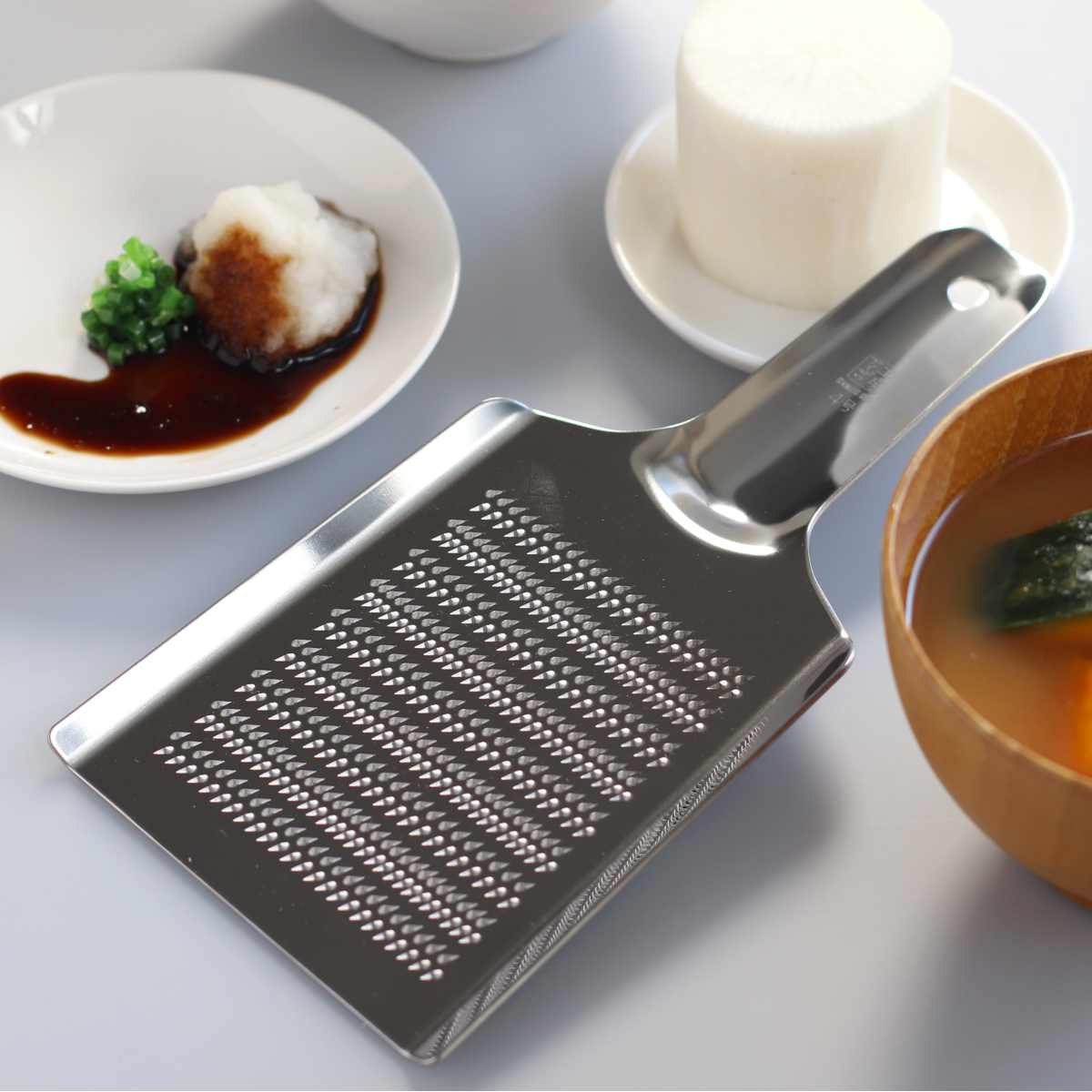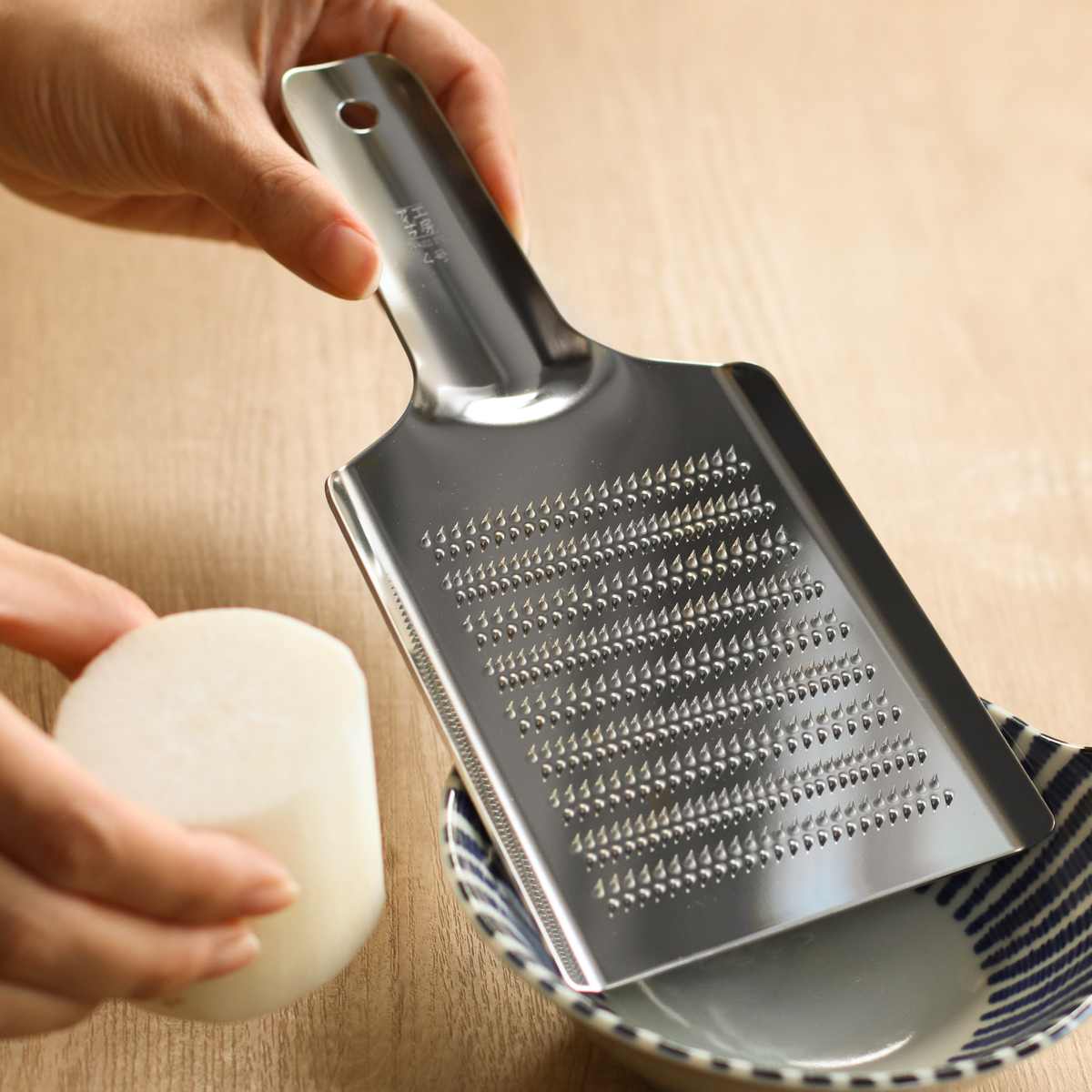 表面は、大根や山芋、りんごをおろすのに最適です。薬味用の細かい刃がついた裏面は、生姜やにんにく、ワサビなど薬味の風味を損なうことなくおろせます。両面使用できる使い勝手の良いおろし金です。