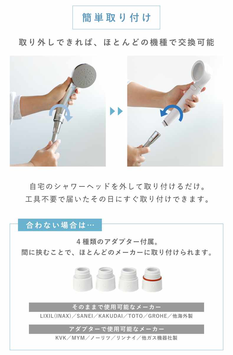 | 内容量 | シャワーヘッド:1個 アダプター4種、保証登録カード |