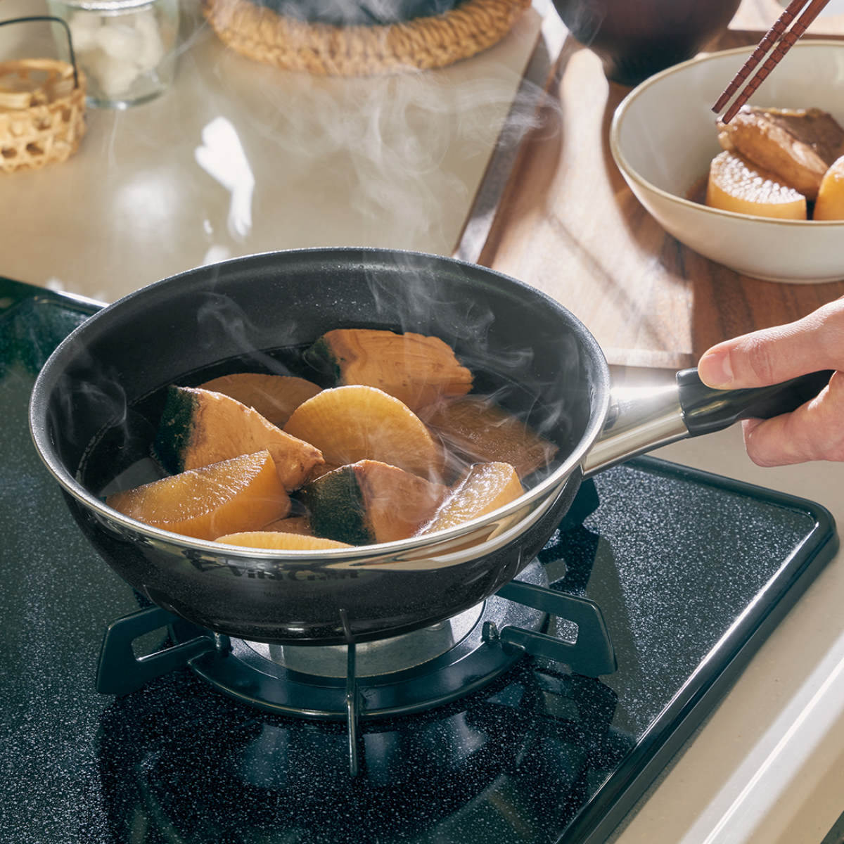 熱効率に優れたステンレスとアルミの全面2層構造で、熱伝導がよく食材にムラなく火が入ります。また、円盤を回転させながら成型するスピニング加工により側面を薄く仕上げることで、底面からの熱伝導性はそのままに、軽量化を実現しました。