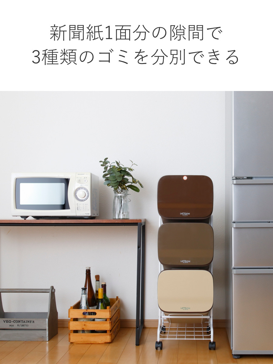 わずかなスペースで3種類のゴミが捨てられる分別ゴミ箱です。縦に積み重ねているので大容量ながら、新聞紙1面分の隙間があれば設置可能です。ワンルームやマンション住まいの方にオススメです。