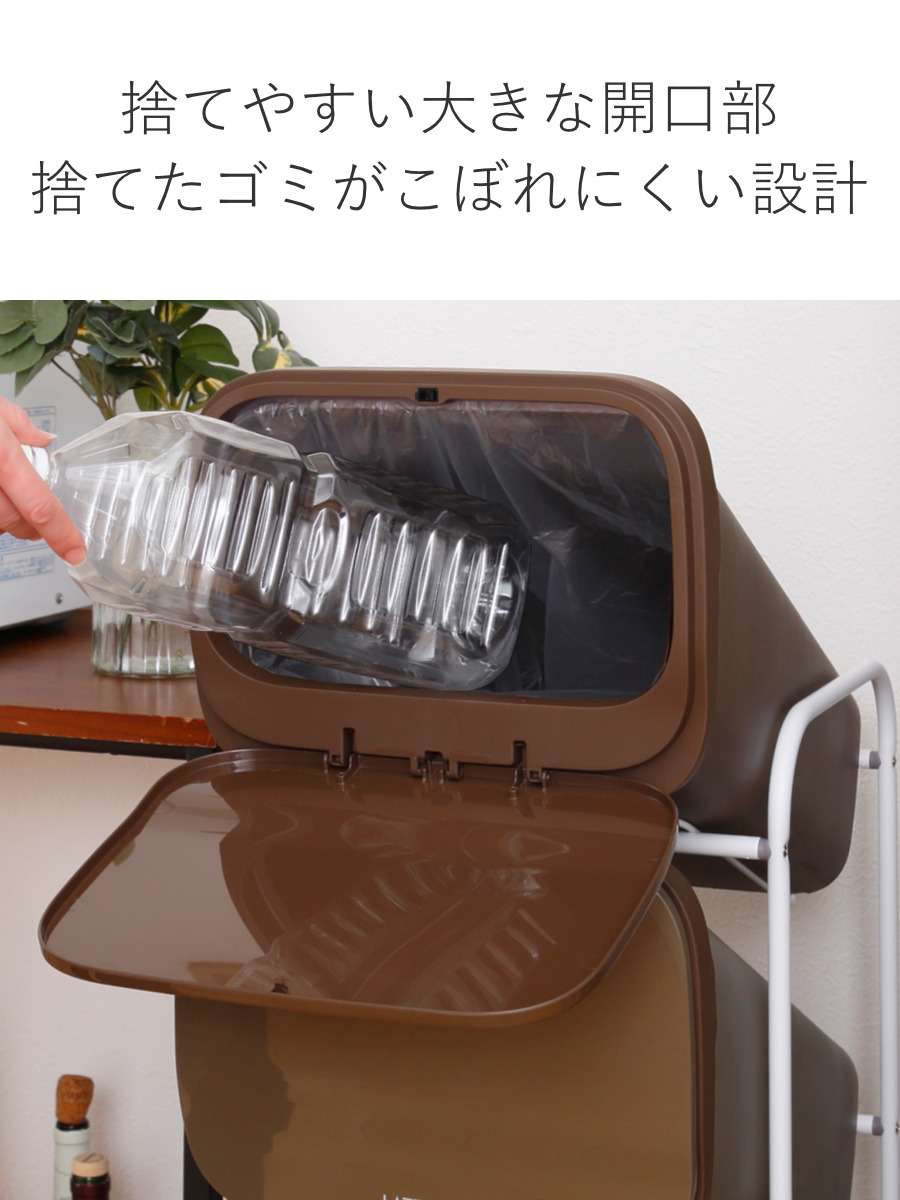 かさばるゴミも捨てやすい大きな開口部です。ふたは下向きに開くので開けっ放しにでき、捨てたゴミがこぼれにくい設計です。