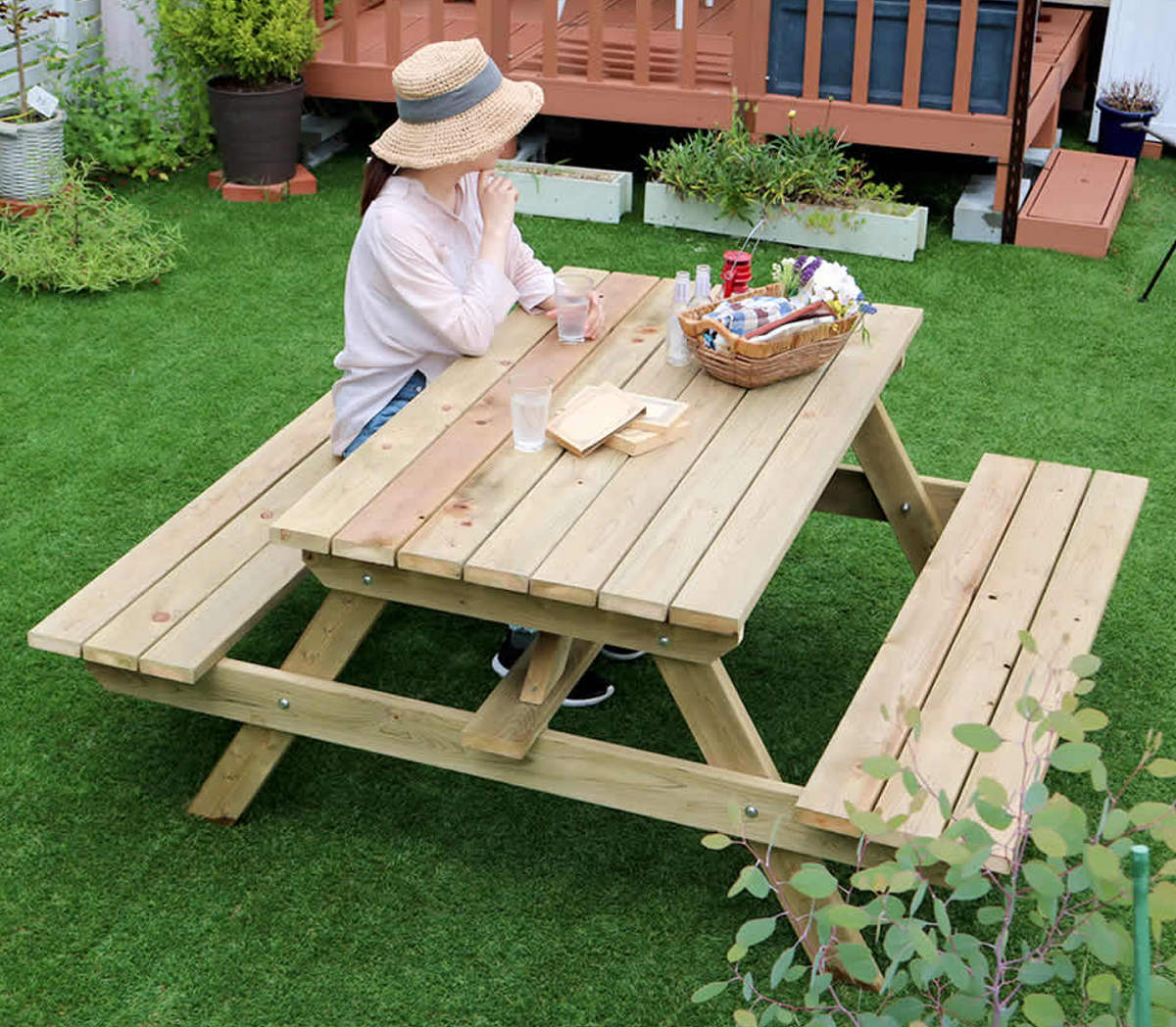 天気のいい日にランチをしたり、読書をしたり、お子さまの庭遊びを見守ったり。家族がいつも集まる場所にぴったりのピクニックテーブルです。テーブルとベンチがひとつになっていて、気軽に使えるのも魅力的です。